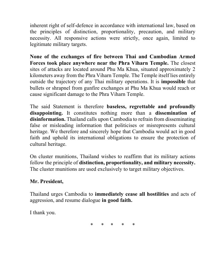 แม้จะมีความอดทนอย่างที่สุด ประเทศไทยก็ถูกบังคับให้ต้อง กระทำเพื่อป้องกันตนเองภายใต้มาตรา 51 ของกฎบัตรสหประชาชาติ การตอบสนองของเราถูกจำกัดอย่างเคร่งครัดในขอบเขต ได้สัดส่วน และมุ่งเป้าไปที่การทำให้ภัยคุกคามที่กำลังจะเกิดขึ้นจากกองกำลังกัมพูชาเป็นกลางเท่านั้น มาตรการทั้งหมดมุ่งเป้าไปที่เป้าหมายทางทหารที่ชอบด้วยกฎหมาย โดยมีความพยายามทุกวิถีทางเพื่อหลีกเลี่ยงการทำร้ายพลเรือน