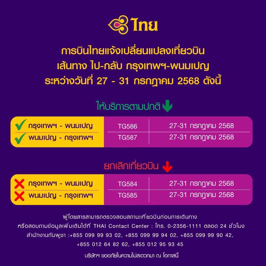บริษัท การบินไทย จำกัด (มหาชน) ขอแจ้งเปลี่ยนแปลงการให้บริการเที่ยวบินในเส้นทาง ไป-กลับ กรุงเทพฯ–พนมเปญ ระหว่างวันที่ 27–31 กรกฎาคม 2568 ดังนี้