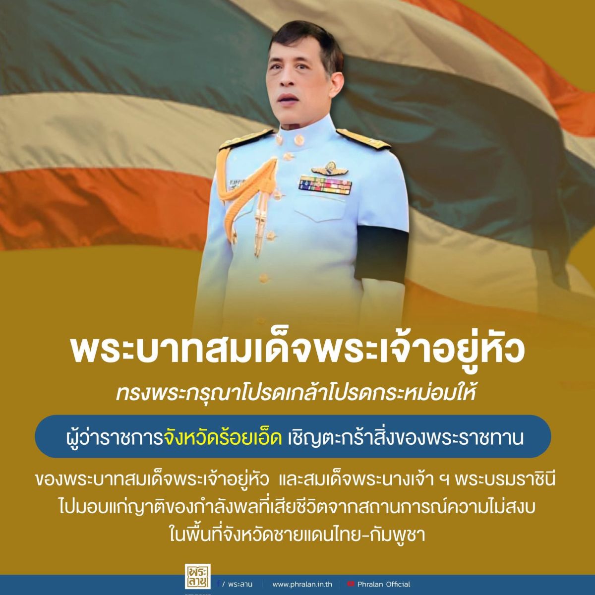 ในหลวง - พระราชินี โปรดเกล้าฯ ให้ ผู้ว่าราชการจังหวัดร้อยเอ็ด เชิญตะกร้าสิ่งของพระราชทาน ไปมอบแก่ญาติของกำลังพลที่เสียชีวิตจากสถานการณ์ความไม่สงบในพื้นที่จังหวัดชายแดนไทย-กัมพูชา
