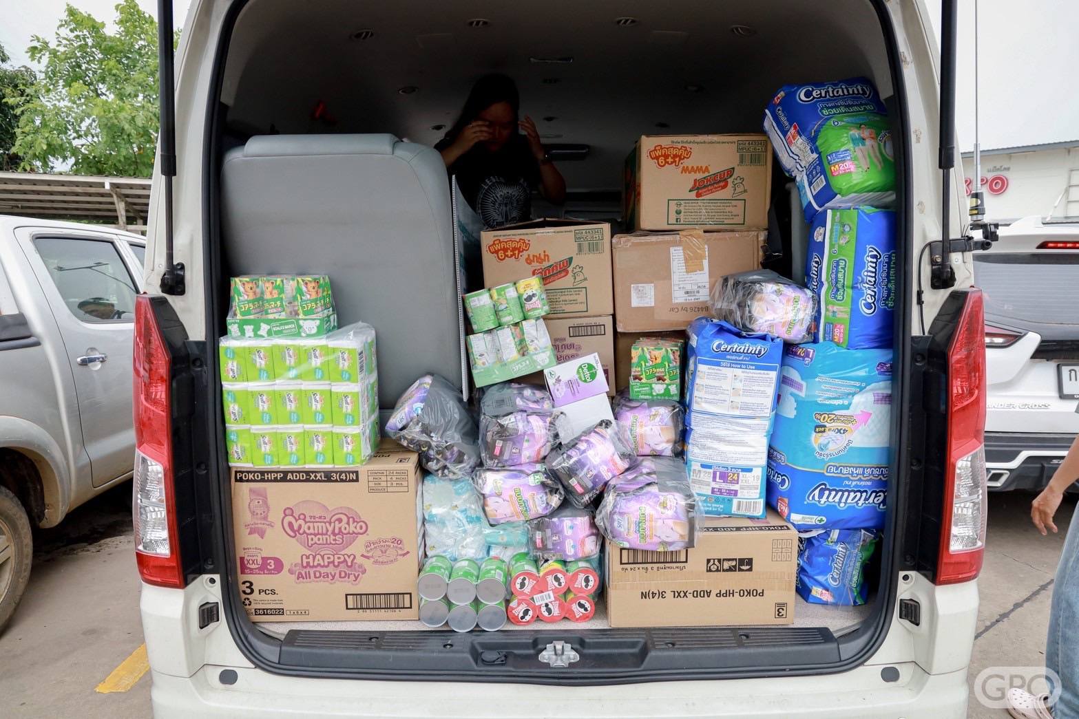 จากนั้นเวลา 16.00 น. ได้ลงพื้นที่สร้างขวัญและกำลังใจพร้อมมอบยาและเวชภัณฑ์ที่จำเป็นรวมถึงเครื่องอุปโภคบริโภค อาทิ ผ้าห่ม ผ้าอนามัย กระดาษ ทิชชู ขนม ผ้าอ้อมผู้ใหญ่ ผ้าอ้อมเด็ก บะหมี่กึ่งสำเร็จรูป เป็นต้น ซึ่งได้รับการสนับสนุนจากกรรมการองค์การเภสัชกรรม ผู้บริหาร ผู้ปฏิบัติงานองค์การเภสัชกรรมและครอบครัว ณ ศูนย์ช่วยเหลือผู้อพยพจังหวัดบุรีรัมย์
