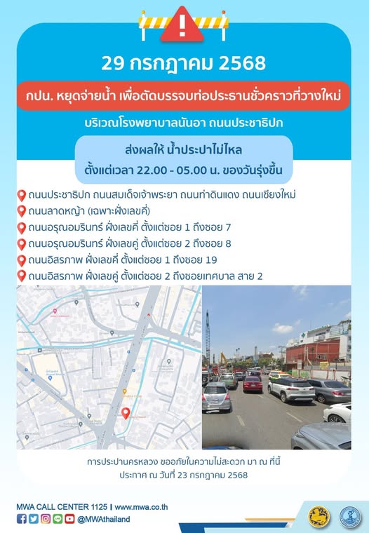 การประปานครหลวง (กปน.) ขอแจ้งให้ทราบว่า จะดำเนินการตัดบรรจบท่อประธานเดิมเข้ากับท่อประธานชั่วคราวที่วางใหม่ ในพื้นที่บริเวณโรงพยาบาลนันอา ถนนประชาธิปก เพื่อให้ประชาชนได้รับบริการน้ำประปาอย่างเพียงพอและทั่วถึง จึงมีความจำเป็นต้องหยุดจ่ายน้ำ เป็นการชั่วคราว ในคืนวันอังคารที่ 29 กรกฎาคม 2568 ตั้งแต่เวลา 22.00 - 05.00 น. ของวันรุ่งขึ้น โดยระหว่างดำเนินการ ส่งผลให้ น้ำประปาไม่ไหล ในพื้นที่ดังต่อไปนี้
