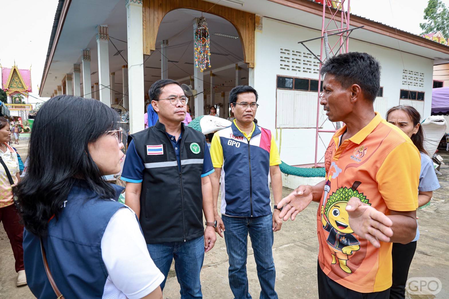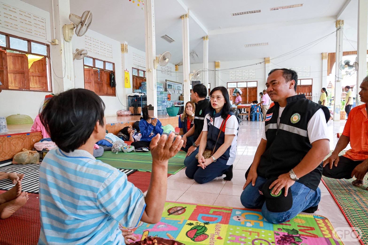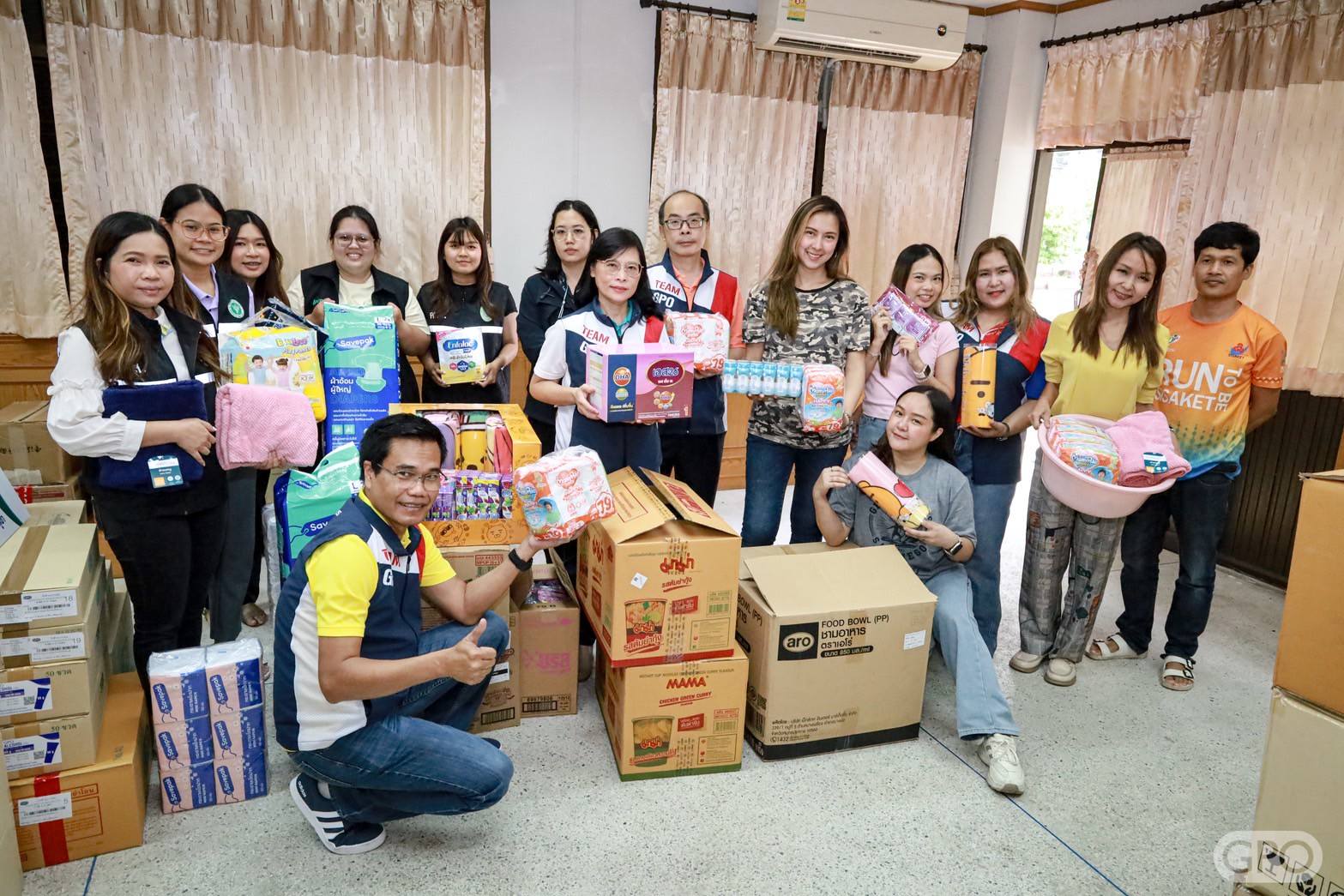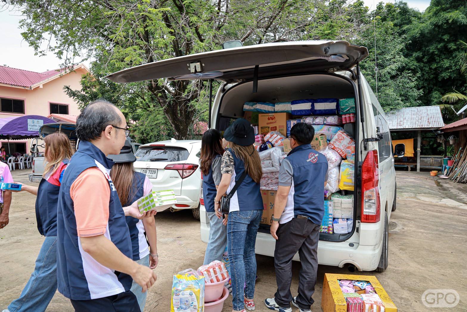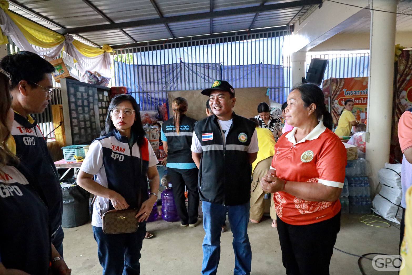 จากนั้น ลงพื้นที่สร้างขวัญและกำลังใจพร้อมมอบยาและเวชภัณฑ์ที่จำเป็นรวมถึงเครื่องอุปโภคบริโภค อาทิ ผ้าห่ม ผ้าอนามัย กระดาษ ทิชชู ขนม ผ้าอ้อมผู้ใหญ่ ผ้าอ้อมเด็ก บะหมี่กึ่งสำเร็จรูป เป็นต้น ซึ่งได้รับการสนับสนุนจากกรรมการองค์การเภสัชกรรม ผู้บริหาร ผู้ปฏิบัติงานองค์การเภสัชกรรมและครอบครัว ให้กับศูนย์พักพิงในจังหวัดศรีสะเกษ