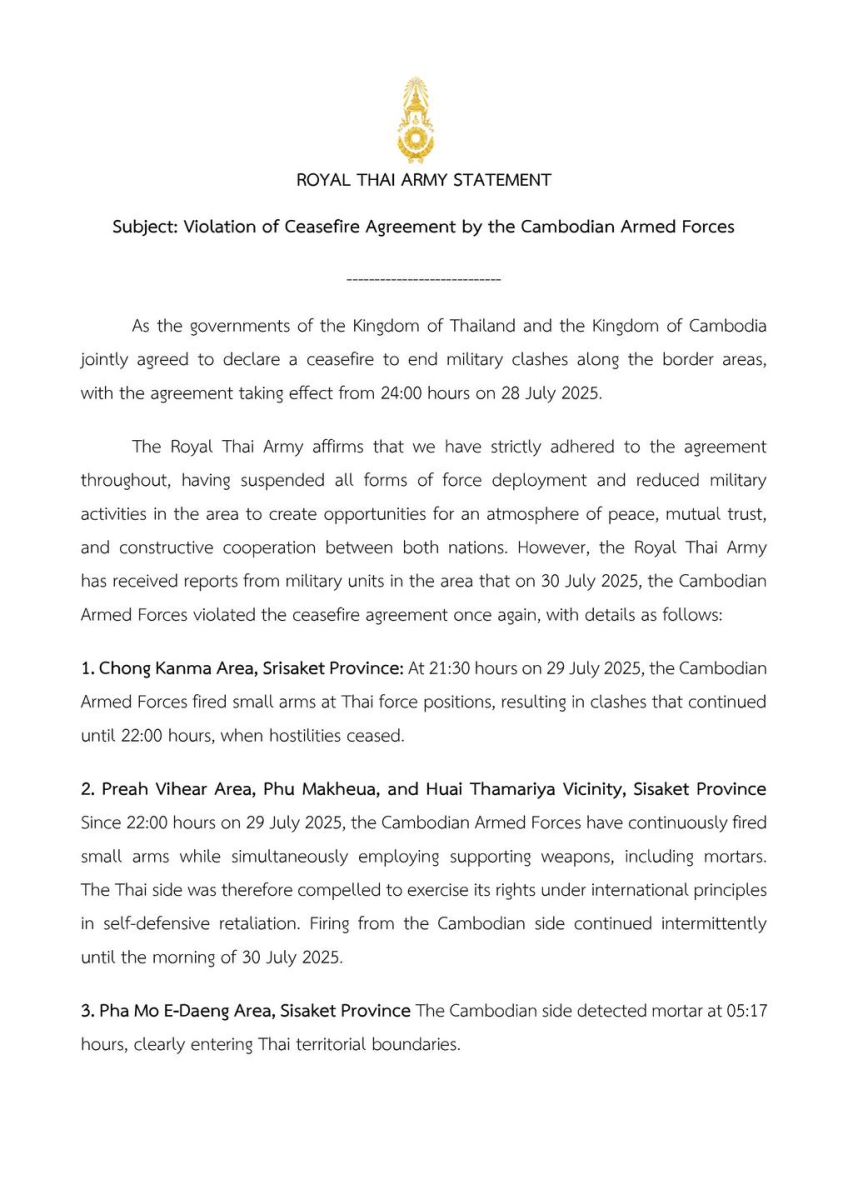 The Royal Thai Army strongly condemns the irresponsible actions of the Cambodian Armed Forces and affirms its commitment to upholding the highest principles of restraint, peace, and humanity. Nevertheless, should violations continue, the Royal Thai Army will take appropriate and necessary measures decisively to protect Thai sovereignty and the safety of Thai citizens without exception.