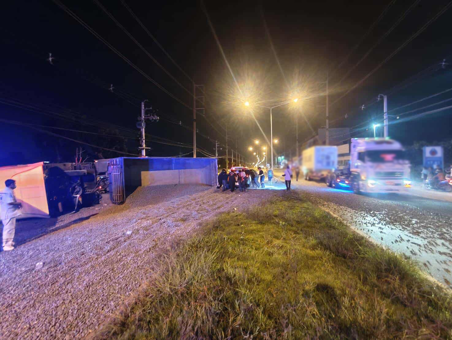 เวลา 23.30 น. วันที่ 30 กรกฎาคม 2568 รับแจ้งว่ามีอุบัติเหตุ ถนนเลียบคลอง 7 เข้ามาจากลำลูกกา มาประมาณ 300 เมตร มีรถพ่วง 18 ล้อ รถกระบะ และรถนั่งส่วนบุคคล ชนกัน แล้วรถพ่วง 18 ล้อพลิกตะแคง มีหินกรวดที่บรรทุกมาตกเหลื่อนบนพื้นผิวถนน กีดขวางฝั่งมุ่งหน้าถนนรังสิต-นครนายก ทุกช่องทาง มีผู้บาดเจ็บ 3 ราย อาสาสมัครนำส่ง รพ.ใกล้เคียงแล้ว