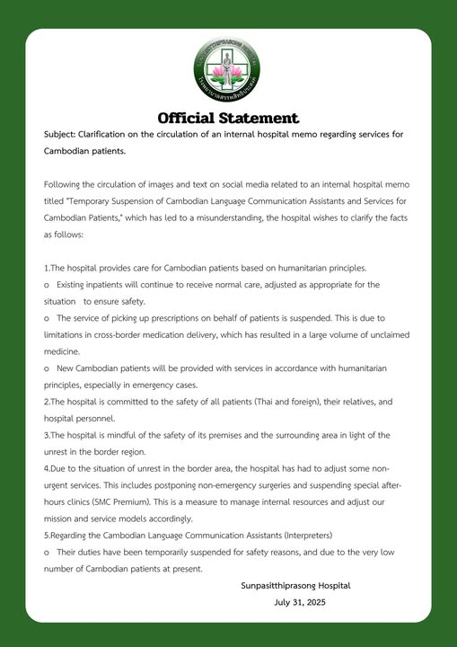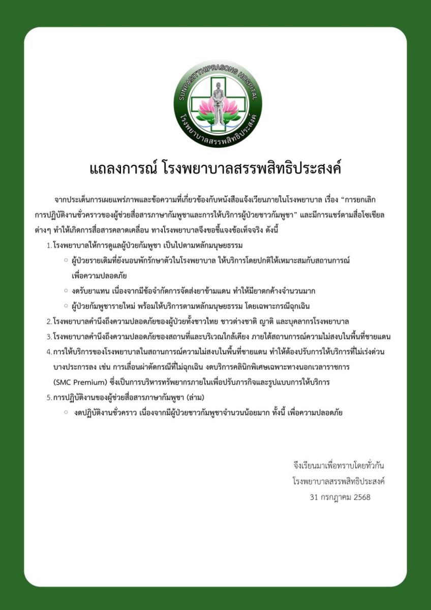 31 ก.ค. 2568 นพ.มนต์ชัย วิวัฒนาสิทธิพงศ์ ผู้อำนวยการโรงพยาบาลสรรพสิทธิประสงค์ แถลงถึงกรณีมีการส่งต่อข้อมูลทางโซเชียลมีเดีย ว่าโรงพยาบาลสรรพสิทธิประสงค์ จ.อุบลราชธานี แถลงการณ์ระบุว่า จากประเด็นการเผยแพร่ภาพและข้อความที่เกี่ยวข้องกับหนังสือแจ้งเวียนภายในโรงพยาบาล เรื่อง การยกเลิกเลิกการปฏิบัติงานชั่วคราว ของผู้ช่วยสื่อสารภาษากัมพูชา และการให้บริการผู้ป่วยชาวกัมพูชา ซึ่งมีการแชร์ตามสื่อโซเชียลต่างๆ ทำให้เกิดการสื่อสารคลาดเคลื่อน ทางโรงพยาบาลจึงขอชี้แจงข้อเท็จจริง ดังนี้