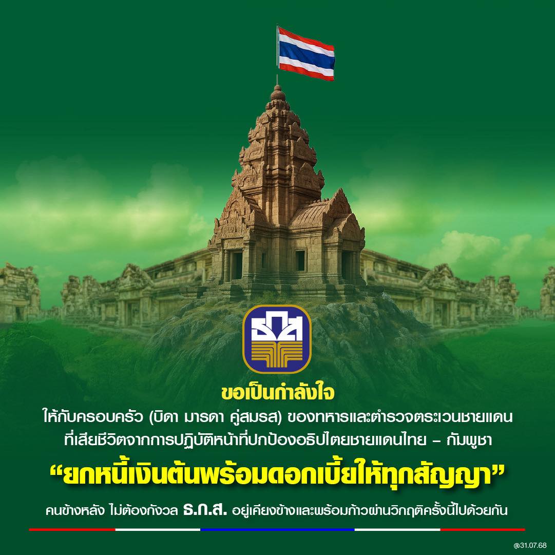 (31 ก.ค.2568) บอร์ด ธ.ก.ส. มีมติเห็นชอบการให้ความช่วยเหลือครอบครัวทหาร และ ตชด. วีรบุรุษผู้เสียสละชีวิต จากการปฏิบัติหน้าที่ในเหตุการณ์ความไม่สงบระหว่างประเทศไทย - กัมพูชา ที่บิดา - มารดา หรือคู่สมรสเป็นลูกค้า ธ.ก.ส. โดยยกหนี้ในส่วนของต้นเงินกู้ทุกสัญญา และยกหนี้ในส่วนของดอกเบี้ยทั้งจำนวน ภายใต้สัญญาที่ใช้แหล่งเงินทุน ธ.ก.ส. เพื่อให้ความช่วยเหลือและสงเคราะห์ลูกหนี้ และลดภาระให้สามารถดำรงชีพต่อไปได้อย่างมั่นคง