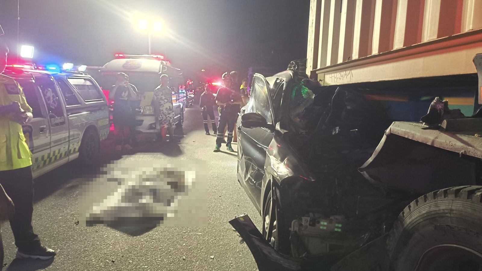 รถนั่งส่วนบุคคลชนเข้าท้ายรถเทรลเลอร์ ริมถนนทางหลวงหมายเลข 3 (สุขุมวิท) สาววัย 35 ปีเสียชีวิตในซากรถ จ.ชลบุรี