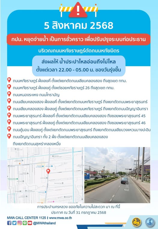 การประปานครหลวง (กปน.) ขอแจ้งให้ทราบว่า จะดำเนินการปรับปรุงระบบท่อประธาน ในพื้นที่บริเวณถนนหทัยราษฎร์ตัดถนนหทัยมิตร เพื่อให้ประชาชนได้รับบริการน้ำประปาอย่างเพียงพอและทั่วถึง จึงมีความจำเป็นต้องหยุดจ่ายน้ำ เป็นการชั่วคราว ในคืนวันอังคารที่ 5 สิงหาคม 2568 ตั้งแต่เวลา 22.00 - 05.00 น. ของวันรุ่งขึ้น โดยระหว่างดำเนินการ ส่งผลให้ น้ำประปาไหลอ่อนถึงไม่ไหล ในพื้นที่ดังต่อไปนี้