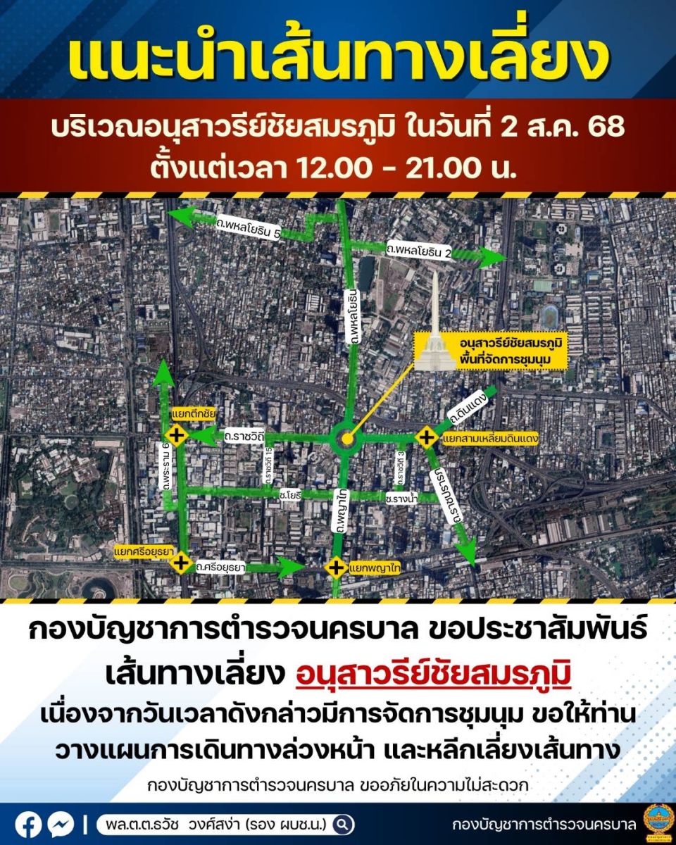 กองบัญชาการตำรวจนครบาล แจ้งประชาสัมพันธ์เส้นทางเลี่ยงบริเวณอนุสาวรีย์ชัยสมรภูมิ ในวันที่ 2 สิงหาคม 2568 ตั้งแต่เวลา 12.00 - 21.00 น. เนื่องจากมีการชุมนุมบริเวณอนุสาวรีย์ชัยสมรภูมิ อาจส่งผลกระทบต่อการจราจรโดยรอบ