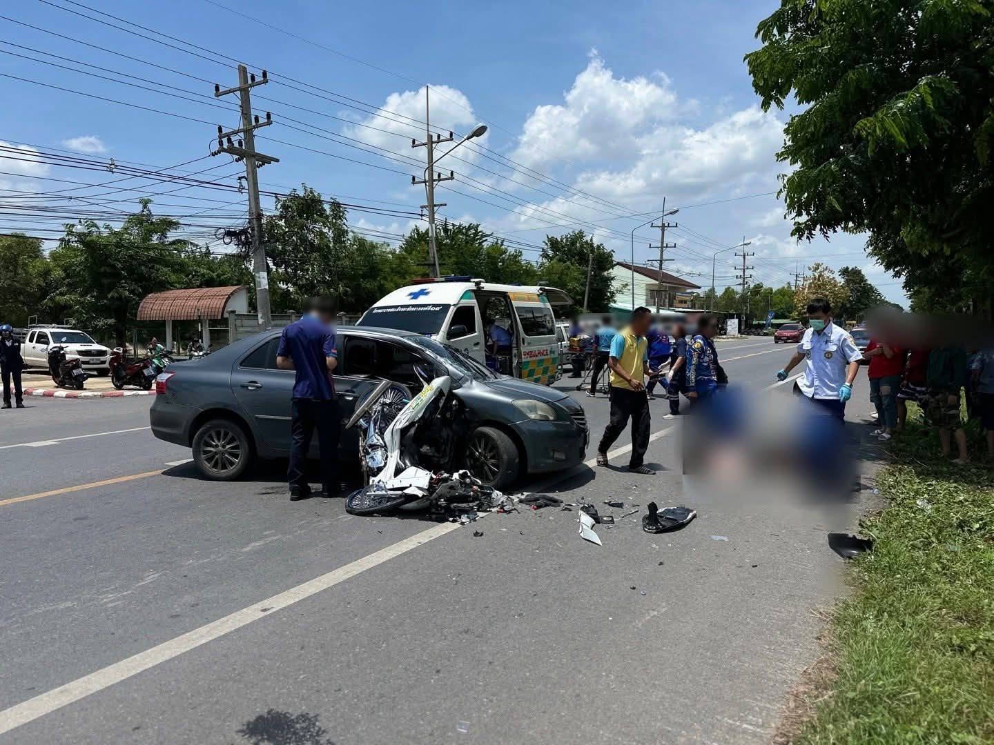 รถจักรยานยนต์ชนกับรถนั่งส่วนบุคคลเข้าอย่างจังกลางถนนแสงชูโตสายเก่า หนุ่มเมียนมา วัย 23 ปีเสียชีวิต จ.กาญจนบุรี