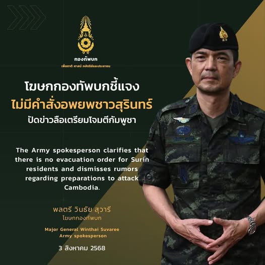 วันที่ 4 สิงหาคม 2568 ผู้สื่อข่าวรายงานว่า เมื่อวันที่ (3 ส.ค.2568) เวลา 20.40 น. กองทัพบกออกมาปฏิเสธข่าวลือที่แพร่สะพัดบนโซเชียลมีเดีย หลังมีการอ้างว่า ฮุน เซน ประธานวุฒิสภากัมพูชา แชร์โพสต์ของโฆษกกระทรวงกลาโหมกัมพูชา ระบุว่า กองทัพบกไทยสั่งอพยพชาว จ.สุรินทร์ ภายในคืนนี้ เพื่อเตรียมเปิดฉากโจมตีกัมพูชา ก่อนการประชุมคณะกรรมการชายแดนทั่วไป (GBC)
