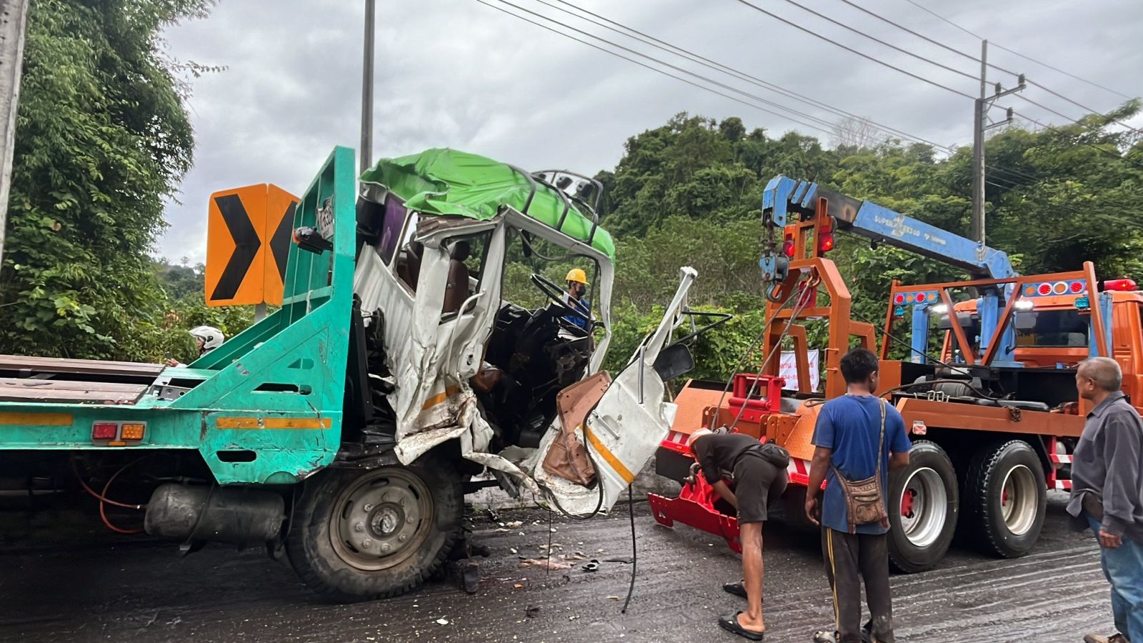 รถบรรทุก วิ่งลงโค้งเนิน 100 ศพ ถนนสายทองผาภูมิ - สังขละบุรี ชนกับรถคันหน้าเสียหายหลายคัน ส่วนคนขับเสียชีวิต จ.กาญจนบุรี