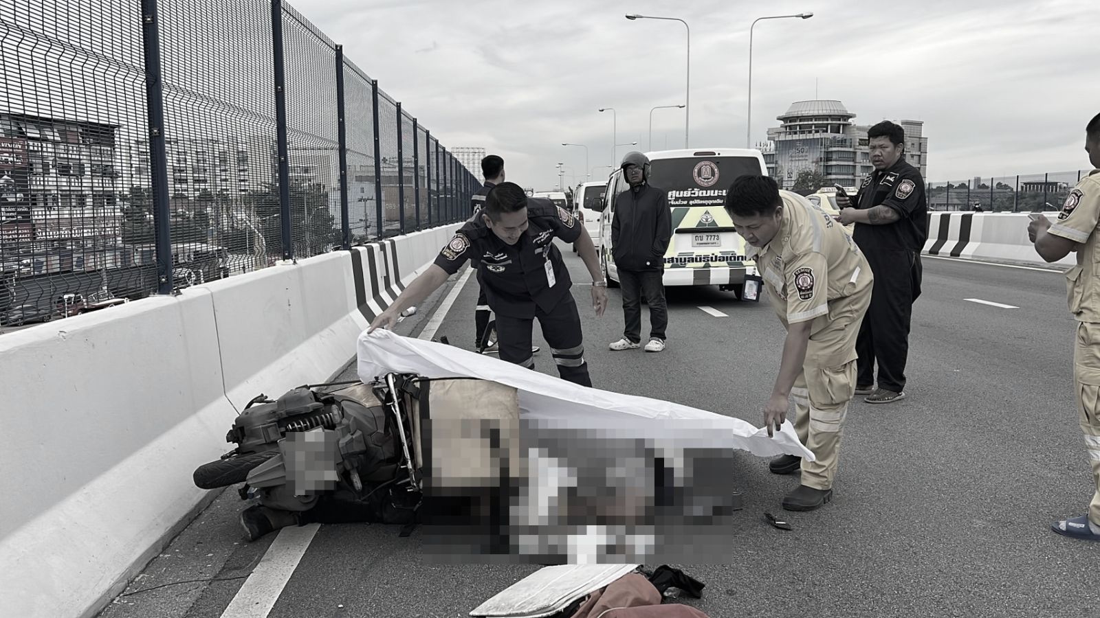 เมื่อเวลา 17.00 น. วันที่ 6 ส.ค.68 เจ้าหน้าที่ตำรวจ สภ. บางกรวยพร้อมเจ้าหน้าที่มูลนิธิป่อเต็กตึ๊ง เดินทางเข้าตรวจสอบหลังจากรับแจ้งมีอุบัติเหตุรถกระบะและรถจักรยานยนต์มีผู้เสียชีวิต 2 ราย เหตุเกิดบนสะพานข้ามวงเวียนพระราม 5 ถนนนครอินทร์ ฝั่งขาเข้ามุ่งหน้าสะพานพระราม 5 ต.บางขุนกอง อ.บางกรวย จ.นนทบุรี