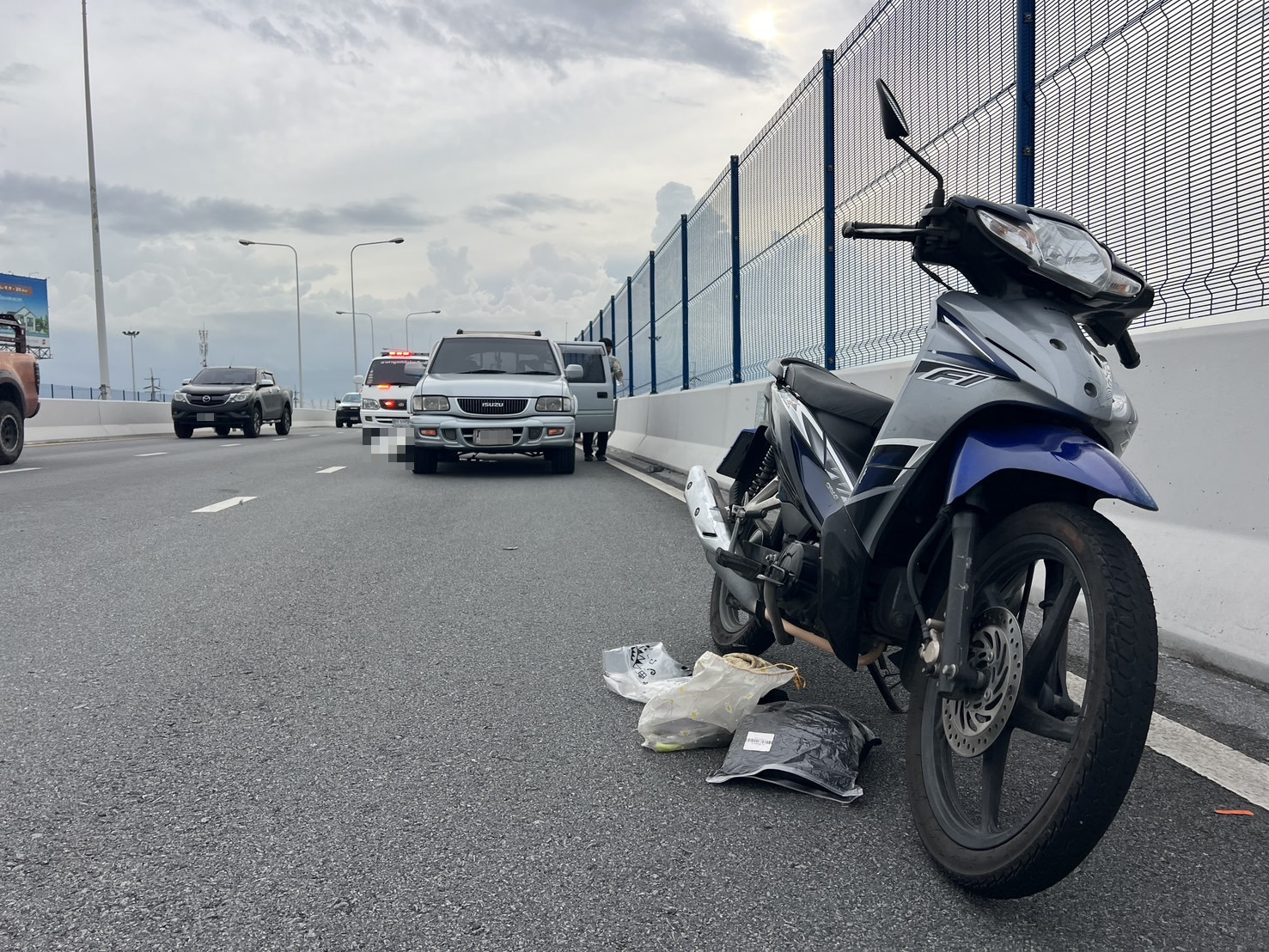 ที่เกิดเหตุ พบร่างผู้เสียชีวิต รายที่ 1 คือ ชายไทย อายุ 44 ปี เป็นเจ้าหน้าที่รักษาความปลอดภัยของบริษัทเอกชนแห่งหนึ่ง นอนเสียชีวิตอยู่ข้างรถยนต์กระบะยี่ห้อ อีซูซุ สีเทา ป้ายทะเบียน กทม. ที่กันชนท้ายรถมุมขวาพบร่องรอยชนยุบเสียหาย ห่างออกไปพบรถจักรยานยนต์ ยี่ห้อ ฮอนด้า รุ่น เวฟ สีน้ำเงิน-ดำ ป้ายทะเบียน กทม. ของผู้เสียชีวิตจอดอยู่ และพบรถจักรยานยนต์ยี่ห้อ ฮอนด้า รุ่นคลิก สีเหลือง-ดำ ทะเบียน กทม. อยู่ในลักษณะล้มทับร่างของผู้เสียชีวิต รายที่ 2 คือ ชายไทย อายุ 46 ปี โดยจุดนี้ยังพบร่องรอยขูดที่แบริเออร์ขอบทาง