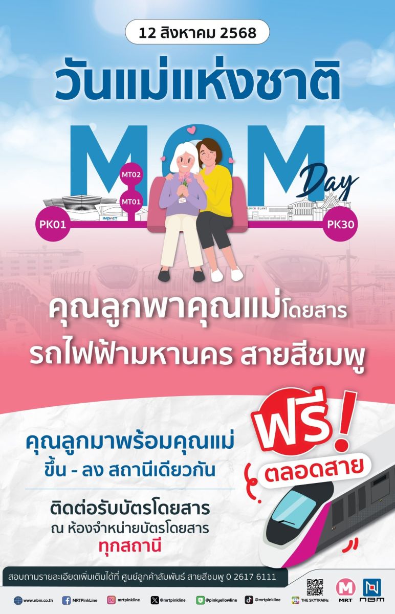 วันนี้ (7 สิงหาคม 2568) นายกาจผจญ อุดมธรรมภักดี ผู้ว่าการการรถไฟฟ้าขนส่งมวลชนแห่งประเทศไทย (รฟม.) กล่าวว่า เนื่องในโอกาสวันเฉลิมพระชนมพรรษา 12 สิงหาคม 2568 สมเด็จพระนางเจ้าสิริกิติ์ พระบรมราชินีนาถ พระบรมราชชนนีพันปีหลวง และถือเป็นวันแม่แห่งชาติด้วยนั้น รฟม. ได้ร่วมกับผู้รับสัมปทานรถไฟฟ้ามหานคร (รถไฟฟ้า MRT) ทั้ง 4 สาย ได้แก่ บริษัท ทางด่วนและรถไฟฟ้ากรุงเทพ จำกัด (มหาชน) (BEM) ผู้รับสัมปทานให้บริการรถไฟฟ้ามหานคร สายฉลองรัชธรรม (MRT สายสีม่วง) และ รถไฟฟ้ามหานคร สายเฉลิมรัชมงคล (MRT สายสีน้ำเงิน) บริษัท อีสเทิร์น บางกอกโมโนเรล จำกัด (EBM) ผู้รับสัมปทานให้บริการรถไฟฟ้ามหานคร สายนัคราพิพัฒน์ (MRT สายสีเหลือง) และบริษัท นอร์ทเทิร์น บางกอกโมโนเรล จำกัด (NBM) ผู้รับสัมปทานให้บริการรถไฟฟ้ามหานคร สายสีชมพู จัดกิจกรรมพิเศษยกเว้นค่าโดยสารรถไฟฟ้า MRT ทั้ง 4 สาย สำหรับคุณแม่ที่เดินทางพร้อมลูก ในวันที่ 12 สิงหาคม 2568 เพียงคุณแม่แสดงตัวที่ห้องออกบัตรโดยสาร เพื่อรับคูปองหรือบัตรโดยสารรถไฟฟ้าฟรีได้ทุกสถานี ตลอดระยะเวลาการเปิดให้บริการ โดยลูกชำระค่าโดยสารปกติ ทั้งนี้ เพื่อเป็นการอำนวยความสะดวกและส่งเสริมการเดินทางท่องเที่ยวสถานที่ต่างๆ รอบเส้นทางรถไฟฟ้า MRT ตลอดจนเป็นการส่งเสริมสร้างความผูกพันในสถาบันครอบครัว