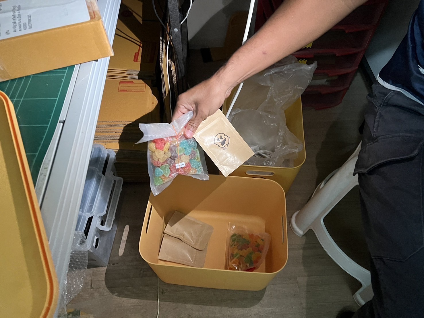 โดยขณะตรวจค้นพบว่า มีการใช้ห้องพักทั้ง 3 ชั้น ของอาคารดังกล่าวดัดแปลงเป็นสถานที่ปลูกต้นกัญชาเพื่อผลิตช่อดอกกัญชาแห้ง และมีการแบ่งบรรจุผลิตภัณฑ์อาหารประเภทเจลลีและคุกกี้ที่มีส่วนผสมของกัญชา เพื่อจัดจำหน่ายให้กลุ่มวัยรุ่นทั่วไป อีกทั้ง มีการใช้ห้องส้วมในชั้นต่าง ๆ เป็นห้องสำหรับผสมและทดลองสูตรกัญชา ก่อนจัดจำหน่ายต่อไป โดยเน้นการขายส่งผ่านสื่อโซเชียลต่าง ๆ เพื่อให้เข้าถึงกลุ่มลูกค้าได้ง่ายขึ้น ซึ่งสถานที่ใช้ผลิตและจัดจำหน่ายไม่ได้รับอนุญาต และไม่ถูกสุขลักษณะอนามัย พร้อมตรวจยึดและอายัดผลิตภัณฑ์กัญชาและอาหาร จำนวนกว่า 481 ชิ้น มูลค่า 921,200 บาท ดังนี้