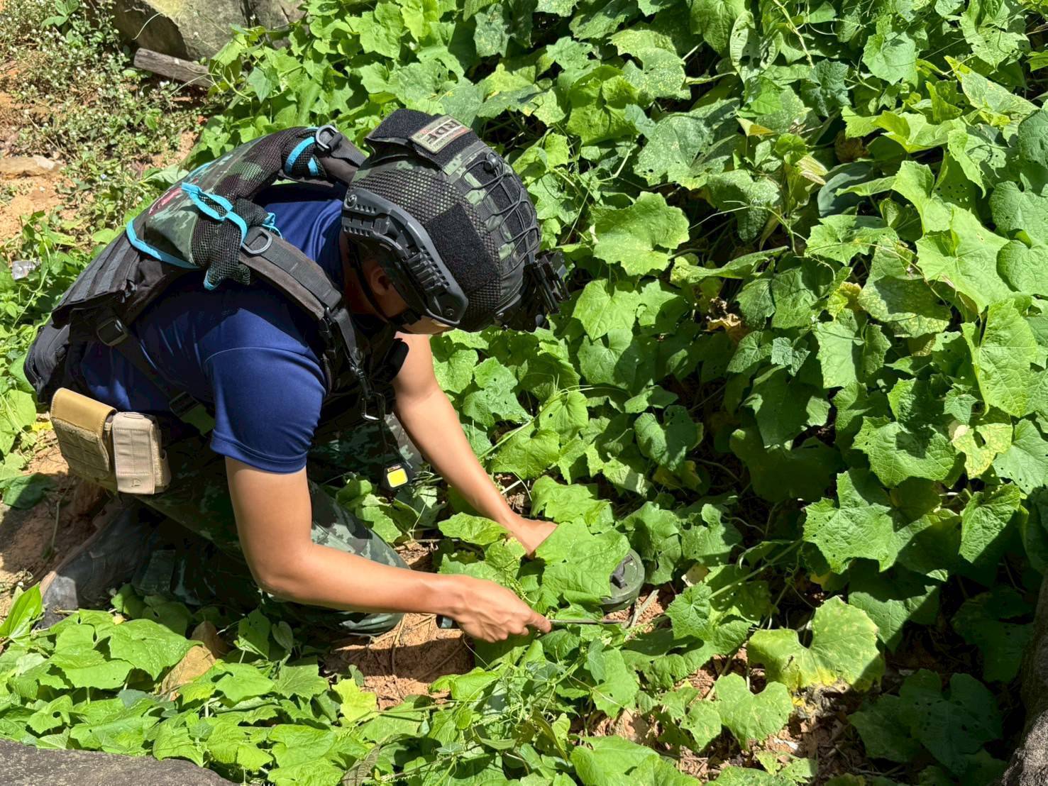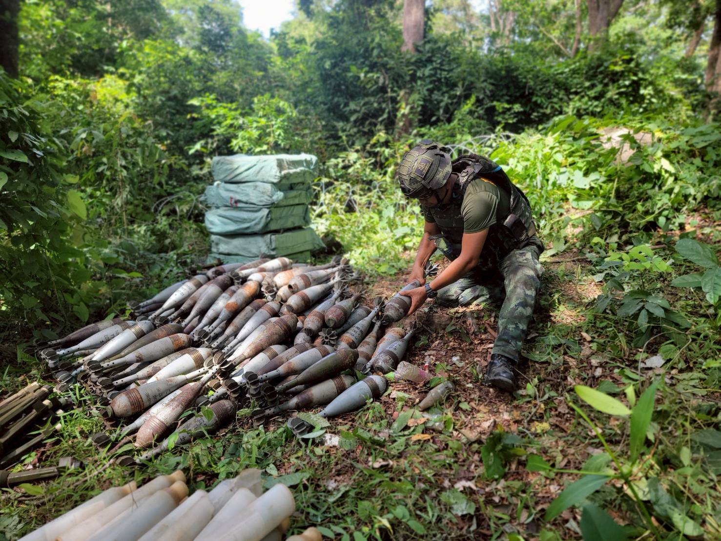 โดยจากการตรวจสอบพบ ทุ่นระเบิดสังหารบุคคลชนิด PMN-2 จำนวน 18 ทุ่น โดย 16 ทุ่น บรรจุในกระสอบ ยังไม่อยู่ในสภาพพร้อมระเบิด และ 2 ทุ่น วางแบบเร่งด่วนโดยไม่ฝังกลบ อยู่ในสภาพพร้อมระเบิด หน่วยทหารช่างได้เก็บกู้ครบทั้ง 18 ทุ่นแล้ว นอกจากนี้ยังตรวจพบลูกกระสุนเครื่องยิงลูกระเบิดและลูกจรวด RPG จำนวนมาก