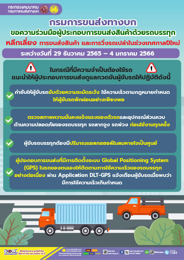 กรมการขนส่งทางบก ประสานขอความร่วมมือผู้ประกอบการขนส่งสินค้าด้วยรถบรรทุกหลีกเลี่ยงการขนส่งสินค้าและการวิ่งรถเปล่าในช่วงเทศกาลปีใหม่ ระหว่างวันที่ 29 ธันวาคม 2565 – 4 มกราคม 2566 เพื่อป้องกันและลดความสูญเสียจากอุบัติเหตุทางถนน