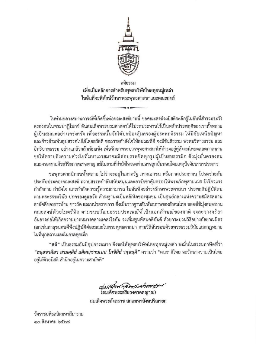 ในท่ามกลางสถานการณ์ที่เกิดขึ้นต่อคณะสงฆ์ยามนี้ ขอคณะสงฆ์จงมีสติระลึกรู้ในอันที่สำรวมระวัง ครองตนในพระปาฏิโมกข์ อันสมเด็จพระบรมศาสดาได้โปรดประทานไว้เป็นหลักประพฤติของเราทั้งหลายผู้เป็นสมณะอย่างเคร่งครัด เพื่อธรรมนั้นจักได้ปกป้องคุ้มครองผู้ประพฤติธรรม ให้มีชัยเหนือปัญหา และก้าวข้ามพ้นอุปสรรคไปได้โดยสวัสดี ขอถวายกำลังใจให้สมณะที่ดี จงมีขันติธรรม พรหมวิหารธรรม และอิทธิบาทธรรม อย่างแกล้วกล้าเข้มแข็ง เพื่อรักษาพระบวรพุทธศาสนาให้ดำรงอยู่คู่สังคมไทยตลอดกาลนาน ขอให้ทราบถึงความห่วงใยที่มหาเถรสมาคมมีต่อบรรพชิตทุกรูปผู้เป็นสหธรรมิก ซึ่งมุ่งมั่นครองตน และครองงานด้วยวิริยภาพอาจหาญ แม้ในยามที่กำลังใจของท่านอาจถูกบั่นทอนโดยเหตุปัจจัยนานาประการ