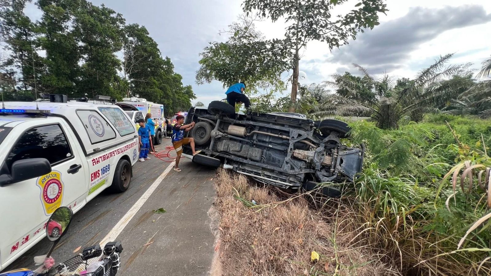 รถกระบะเสียหลักพลิกตะแคง ไถลชนต้นไม้พังยับ คนขับเจ็บติดอยู่ภายในยานพาหนะ จ.ตราด