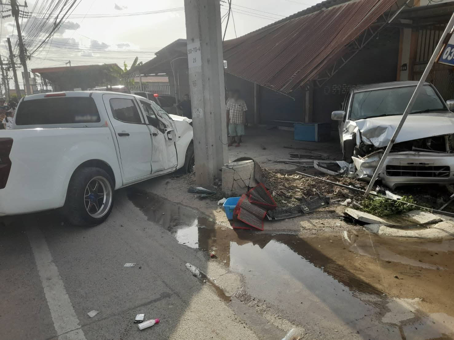 ใกล้กันพบรถยนต์กระบะยี่ห้อ อีซูซุ สีขาว ทะเบียน 4732 กรุงเทพมหานคร สภาพรถชนอัดติดกับเสาไฟฟ้าในลักษณะขวางถนน หน้ารถพังยับ ถุงลมนิรภัยหลุดออกมา ส่วนคนขับยังไม่ทราบชื่อ ได้รับบาดเจ็บถูกนำตัวส่งโรงพยาบาลไปก่อนแล้ว นอกจากนี้ยังมีผู้ได้รับบาดเจ็บอีก 3 คน เป็นคนในครอบครัวเดียวกันที่กำลังช่วยกันนั่งปลูกต้นไม้อยู่หน้าบ้าน ถูกแรงกระแทกจากรถอีกคันที่จอดอยู่ได้รับบาดเจ็บ และยังมีรถยนต์กระบะ นิสสัน ทะเบียน กรุงเทพมหานคร ที่จอดอยู่หน้าบ้านถูกชนอย่างแรงจนเสียหาย