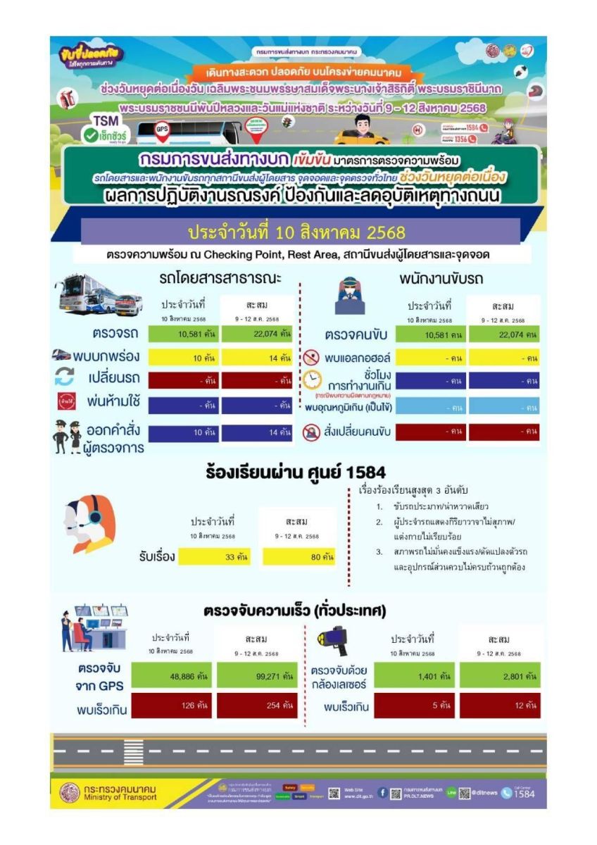 อธิบดีกรมการขนส่งทางบก กล่าวเพิ่มเติมว่า ในส่วนผลการดำเนินการติดตามตรวจสอบการเดินรถโดยสารสาธารณะและรถบรรทุก ด้วยระบบ GPS Tracking ผ่านศูนย์บริหารจัดการเดินรถด้วยระบบ GPS จำนวน 48,886 คัน พบการใช้ความเร็วเกินกฎหมายกำหนด จำนวน 126 คัน ผลตรวจสอบการใช้ความเร็วรถโดยสารและรถบรรทุก ด้วยกล้องเลเซอร์ บนถนนสายหลักและสายรองทั่วประเทศ จำนวน 1,401 คัน พบการใช้ความเร็วเกินกฎหมายกำหนด 5 คัน กรมการขนส่งทางบกจะประสานผู้ประกอบการขนส่ง เจ้าหน้าที่ตำรวจ และหน่วยงานที่เกี่ยวข้องเพื่อกำกับการใช้ความเร็ว ควบคู่กับมาตรการบังคับใช้กฎหมายอย่างเคร่งครัด สำหรับการร้องเรียนเกี่ยวกับรถโดยสารสาธารณะผ่านศูนย์ 1584 ได้รับเรื่องร้องเรียนแล้ว จำนวน 33 เรื่อง โดยเรื่องที่มีการร้องเรียนมากที่สุด 3 อันดับได้แก่ ขับรถประมาท/น่าหวาดเสียว, ผู้ประจำรถแสดงกิริยาวาจาไม่สุภาพ/แต่งกายไม่เรียบร้อย และสภาพรถไม่มั่นคงแข็งแรง/ดัดแปลงตัวรถและอุปกรณ์ส่วนควบไม่ครบถ้วนถูกต้อง กรมการขนส่งทางบกจะเร่งติดตามผู้กระทำผิดมาสอบสวนและดำเนินการลงโทษตามกฎหมายต่อไป ทั้งนี้ พบปัญหาจากการใช้บริการรถโดยสารสาธารณะ สามารถแจ้งสายด่วน 1584 ตลอด 24 ชั่วโมง