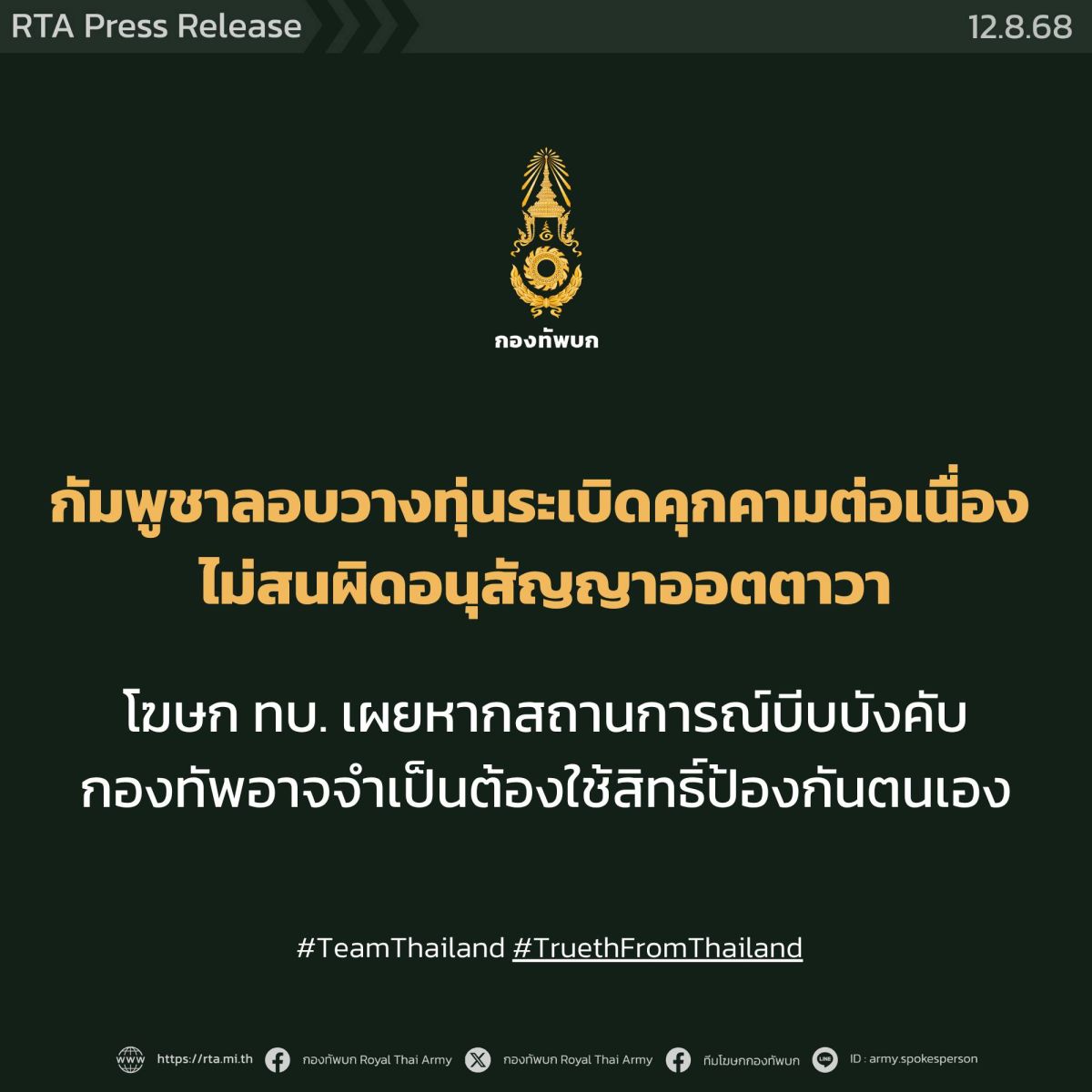ซึ่งที่ผ่านมากองทัพบกได้ยึดมั่นในแนวทางสันติวิธีมาโดยตลอด และไม่ได้เป็นฝ่ายเริ่มก่อน แต่หากสถานการณ์บีบบังคับก็อาจจำเป็นต้องใช้สิทธิ์ในป้องกันตนเองภายใต้หลักกฎหมายระหว่างประเทศในการคลี่คลายสถานการณ์ที่ทำให้ฝ่ายไทยต้องสูญเสียกำลังพลอย่างต่อเนื่อง จากการละเมิดข้อตกลงหยุดยิงและรุกล้ำอธิปไตยของทหารกัมพูชา
