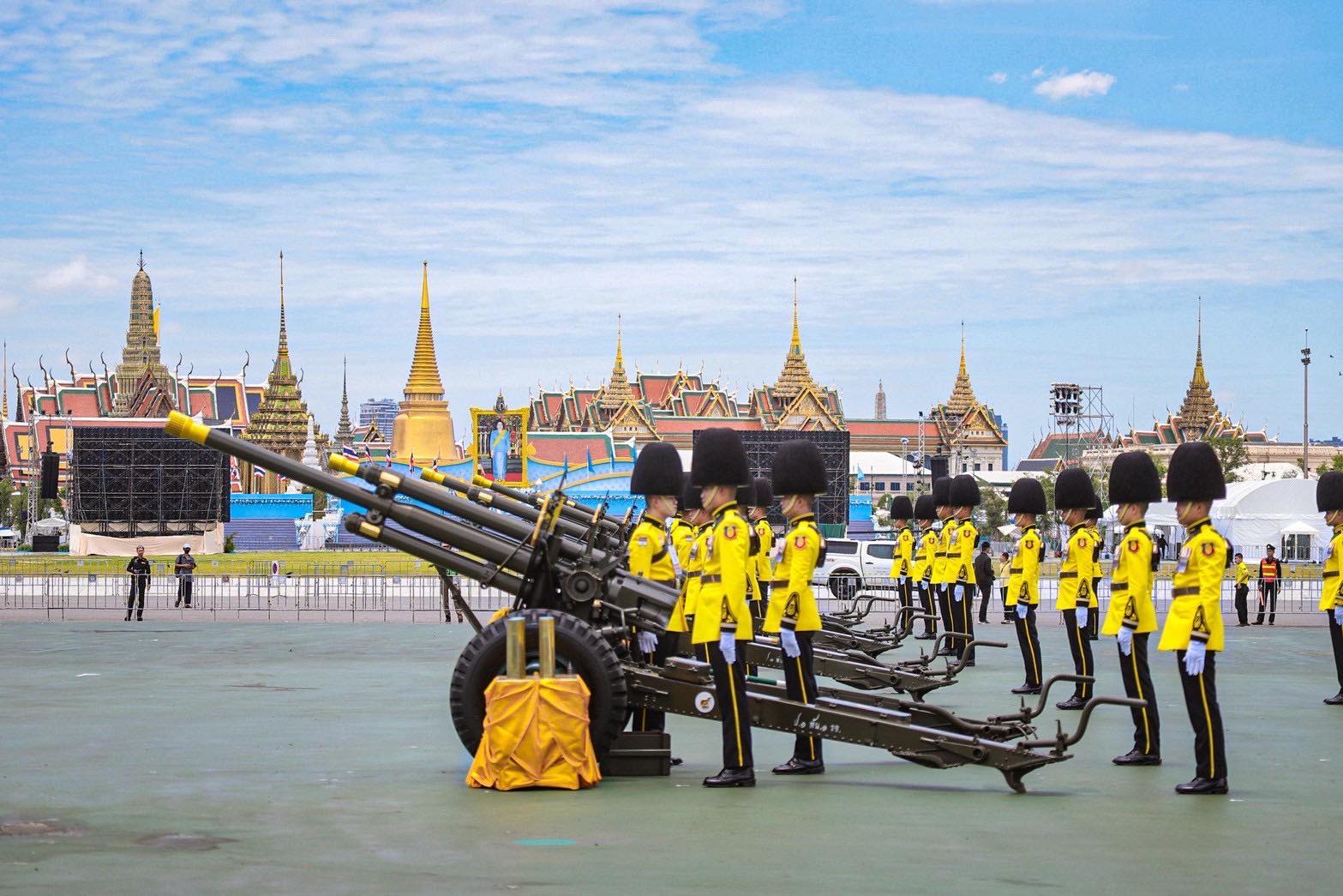 โดยกองร้อยปืนใหญ่ยิงสลุต ใช้ปืนใหญ่เบากระสุนวิถีราบ แบบ 80 ขนาด 75 มิลลิเมตร จำนวน 4 กระบอก ทำการยิงตามจังหวะของเพลงสรรเสริญพระบารมี จำนวน 21 นัด จังหวะ 5 วินาที ทีละกระบอก นับรอบจากขวาไปซ้าย ใช้เวลายิงทั้งหมด 1 นาที 40 วินาที ซึ่งจะดำเนินการยิงสลุตหลวง โดยพร้อมเพรียงกันทั้ง 3 เหล่าทัพ