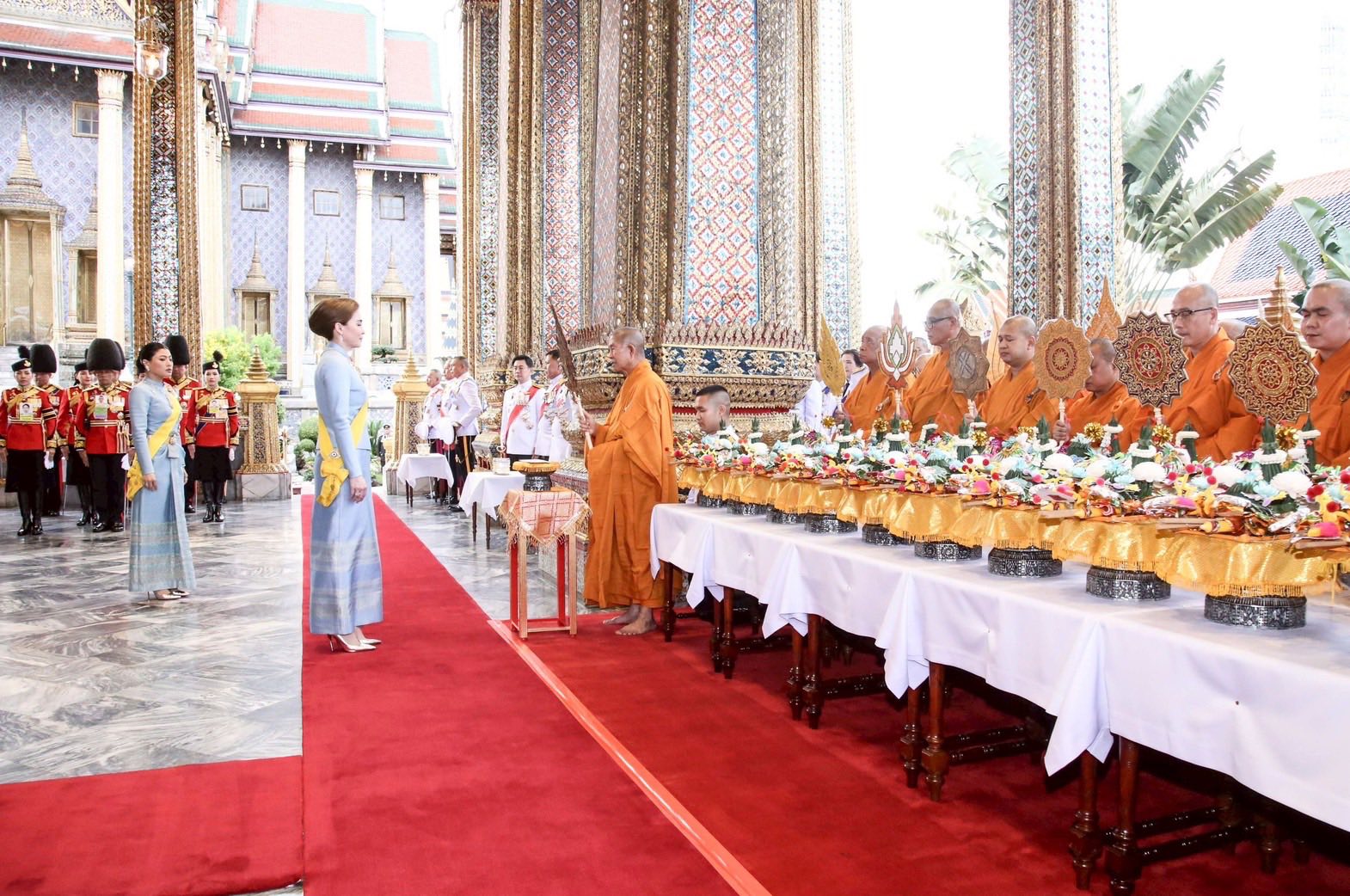 เมื่อเสด็จขึ้นชานหน้าพระอุโบสถวัดพระศรีรัตนศาสดาราม สมเด็จพระนางเจ้าฯ พระบรมราชินี ทรงรับการถวายพระพรสมเด็จพระนางเจ้าสิริกิติ์ พระบรมราชินีนาถ พระบรมราชชนนีพันปีหลวง ของบรรพชิตญวนและจีน แล้วเสด็จเข้าพระอุโบสถ ทรงจุดเทียนพระมหามงคลที่ตั้งอยู่บนธรรมาสน์ศิลา ทรงจุดเทียนเท่าพระองค์ในตู้ข้างธรรมาสน์ศิลา ด้านพระพุทธยอดฟ้าจุฬาโลกย์ และทรงจุดเทียนเท่าพระองค์ในตู้ข้างธรรมาสน์ศิลา ด้านพระพุทธเลิศหล้านภาไลย และทรงจุดธูปเทียนท้ายที่นั่งบูชาพระพุทธมหามณีรัตนปฏิมากร พระพุทธยอดฟ้าจุฬาโลกย์ และพระพุทธเลิศหล้านภาไลย เสร็จแล้ว สมเด็จพระนางเจ้าฯ พระบรมราชินี ทรงจุดธูปเทียนเครื่องนมัสการทองใหญ่บูชาพระรัตนตรัยที่หน้าธรรมาสน์ศิลา ทรงจุดเทียนที่โต๊ะหน้าอาสน์สงฆ์ พระสงฆ์เจริญพระพุทธมนต์นวัคคหายุสมธัมม์ และทรงจุดเทียนที่แท่นมณฑลบูชาเทวดานพเคราะห์ จากนั้น พระราชทานเงินแก่ข้าราชการผู้ทำหน้าที่โหรหลวงบูชาเทวดานพเคราะห์ แล้วเสด็จออกจากพระอุโบสถ ไปประทับรถยนต์พระที่นั่ง เสด็จพระราชดำเนินไปยังพระที่นั่งอมรินทรวินิจฉัย