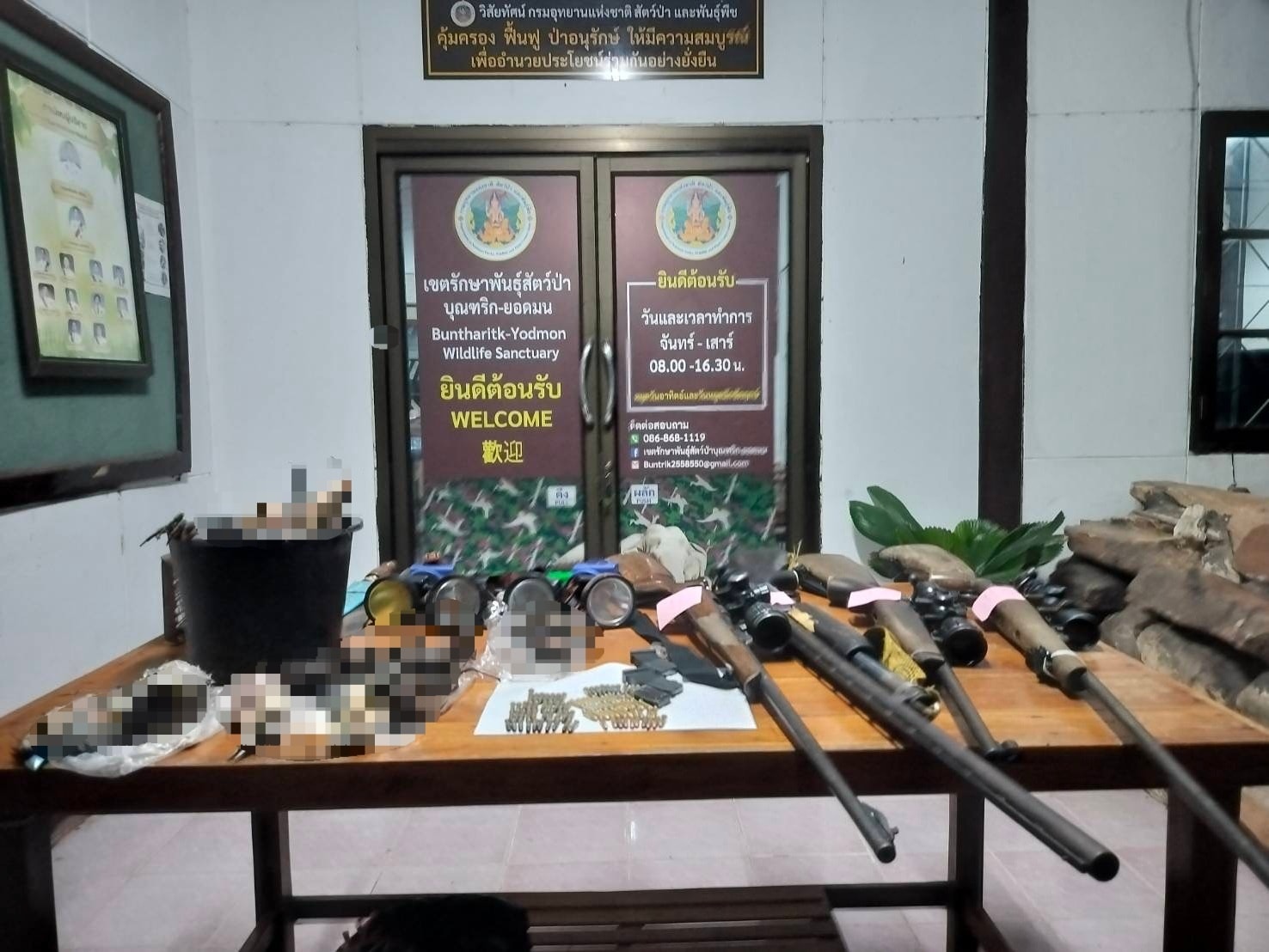 จากการเข้าตรวจค้น เจ้าหน้าที่พบของกลางหลายอย่าง ประกอบด้วย ซากนกยางไฟธรรมดา จำนวน 1 ซาก ซากนกพญาปากกว้างลายเหลือง จำนวน 1 ซาก ซากนกหัวขวานใหญ่สีเทา จำนวน 1 ซาก ซากกระรอกหน้ากระแต จำนวน 8 ซาก ซากกระรอกหลากสี จำนวน 2 ตัว/ซาก ซากกระเล็นขนปลายหูสั้น จำนวน 2 ซาก ปูขน 25 ตัว น้ำหนัก 2 กิโลกรัม ,ปืนลูกซอง จำนวน 1 กระบอก ,ปืนลูกกรดพร้อมลำกล้อง 3 กระบอก, เครื่องกระสุน 87 นัด, แม็กกาซัน 3 อัน ,รถยนต์ 1 คัน ,มีด 2 เล่ม และกระเป๋าเป้ จำนวน 4 ใบ ซึ่งบ่งชี้ว่ากลุ่มผู้ต้องหามีการเตรียมการมาอย่างดีเพื่อเข้ามากระทำผิดในพื้นที่ป่า
