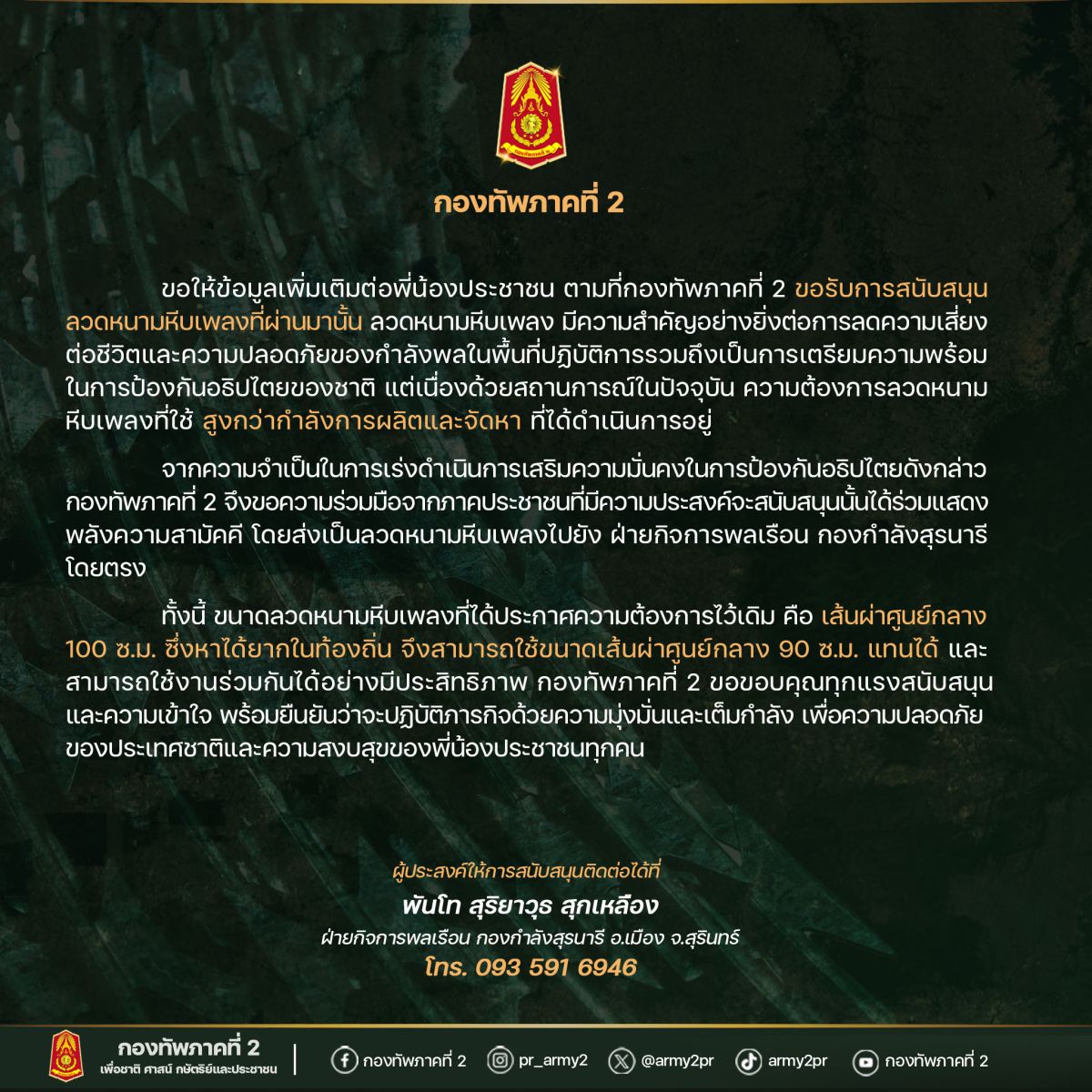 13 สิงหาคม 2568 เพจ กองทัพภาคที่ 2 ขอให้ข้อมูลเพิ่มเติมต่อพี่น้องประชาชน ตามที่กองทัพภาคที่ 2 ขอรับการสนับสนุนลวดหนามหีบเพลงที่ผ่านมานั้น ลวดหนามหีบเพลง มีความสำคัญอย่างยิ่งต่อการลดความเสี่ยงต่อชีวิตและความปลอดภัยของกำลังพลในพื้นที่ปฏิบัติการ รวมถึงเป็นการเตรียมความพร้อมในการป้องกันอธิปไตยของชาติ แต่เนื่องด้วยสถานการณ์ในปัจจุบัน ความต้องการลวดหนามหีบเพลงที่ใช้ สูงกว่ากำลังการผลิตและจัดหา ที่ได้ดำเนินการอยู่