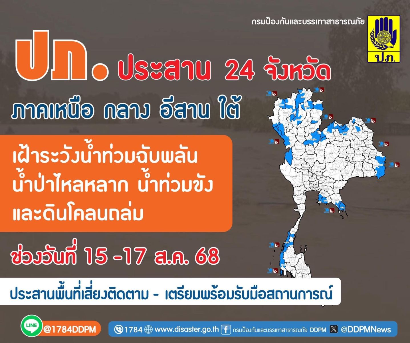 ปภ.ประสาน 24 จังหวัด ภาคเหนือ อีสาน กลาง ใต้ เฝ้าระวังน้ำท่วมฉับพลัน น้ำป่าไหลหลาก น้ำท่วมขัง และดินโคล่นถล่ม ระหว่างวันที่ 15 – 17 ส.ค. 68 ประสานพื้นที่เสี่ยงภัยติดตามสถานการณ์ใกล้ชิดและเตรียมพร้อมรับมือสถานการณ์