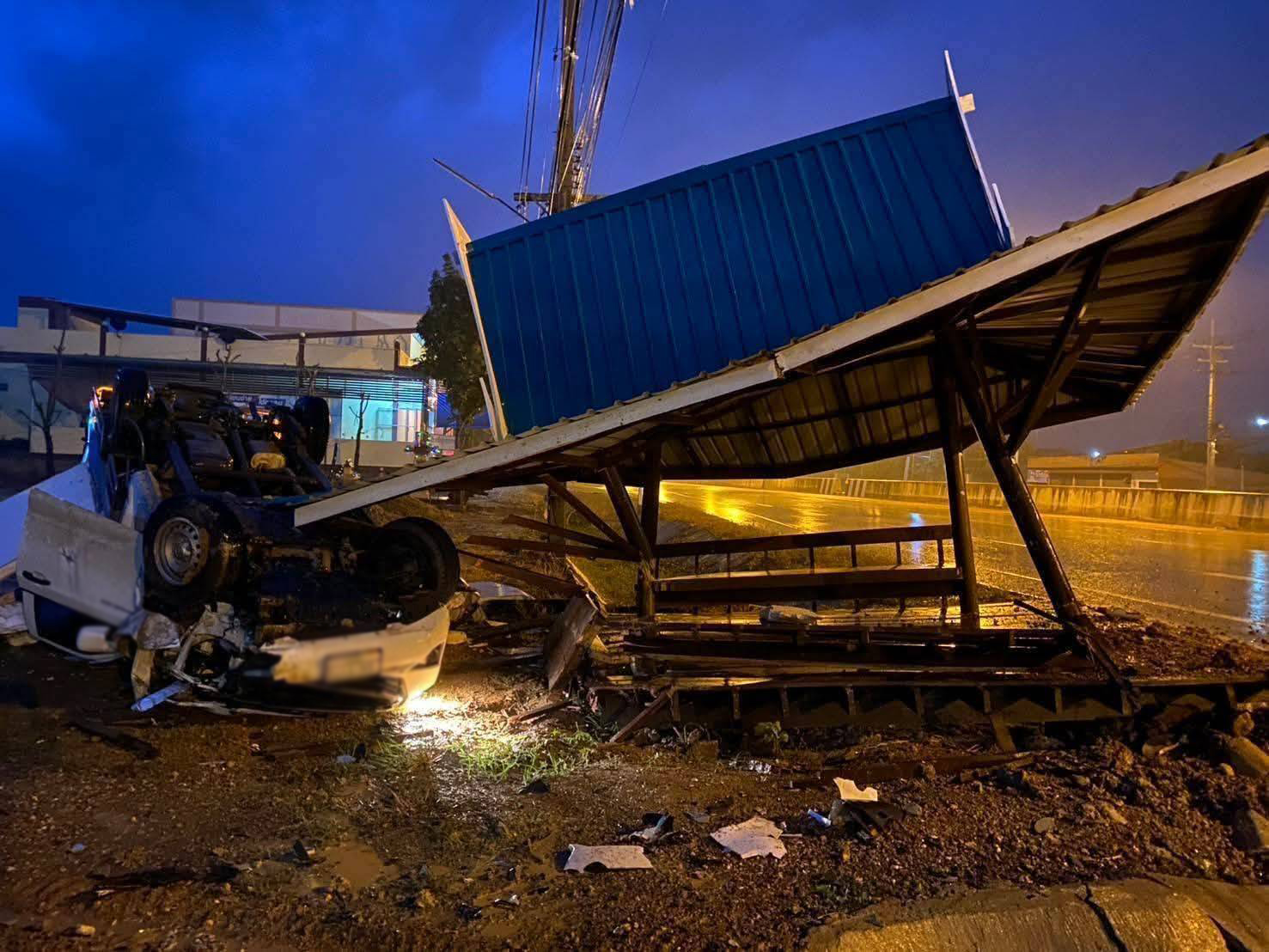กระบะเสียหลักพุ่งชนศาลาริมทาง ริมถนนหมายเลข 106 เสียหายทั้งศาลาและรถพังยับ จ.สุโขทัย