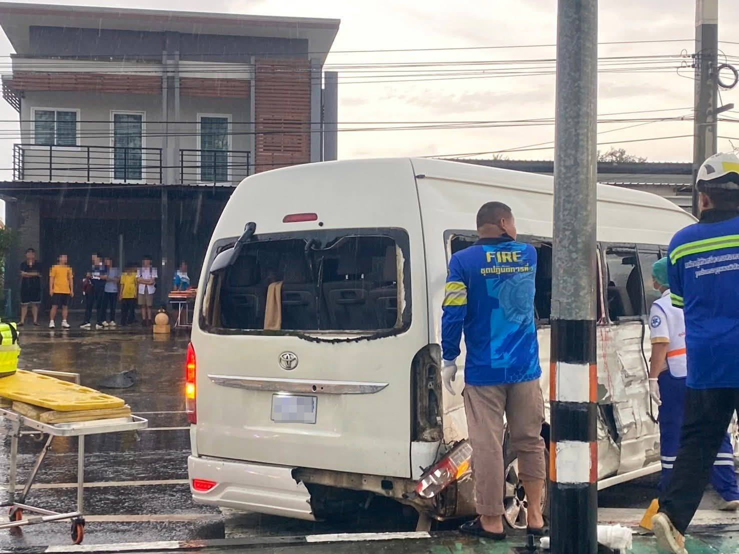 และห่างออกไป พบรถตู้รับ-ส่งนักเรียน ยี่ห้อโตโยต้า สีขาว ป้ายทะเบียน ศรีสะเกษ สภาพข้างรถฝั่งขวา มีร่องรอยการชนได้รับความเสียหาย ตรวจสอบ พบว่า มีผู้ได้รับบาดเจ็บ 11 รายทางอาสาสมัครกู้ชีพ - กู้ภัยให้การช่วยเหลือและนำส่งโรงพยาบาลอุทุมพรพิสัย และพบว่าในที่เกิดเหตุ มีผู้เสียชีวิต 2 ราย เป็นเด็กชาย อายุ 9 ขวบ และเด็กหญิง อายุ 13 ปี