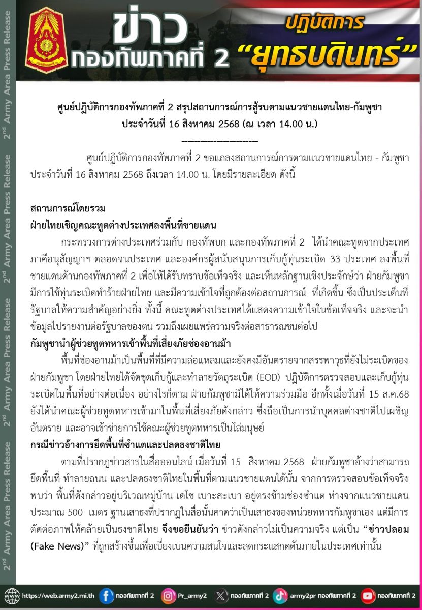 ศูนย์ปฏิบัติการกองทัพภาคที่ 2 สรุปสถานการณ์การสู้รบตามแนวชายแดนไทย-กัมพูชา ประจำวันที่ 16 สิงหาคม 2568 (ณ เวลา 14.00 น.) ระบุว่า