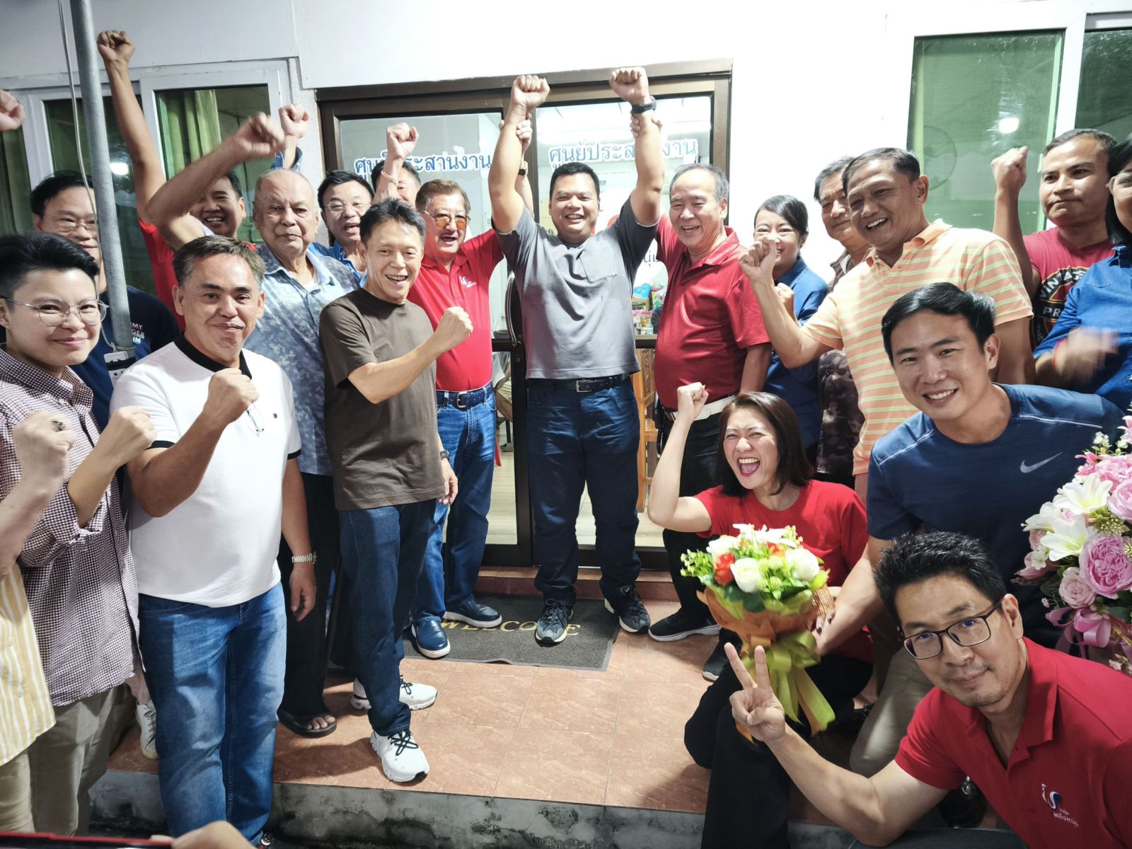 บรรยากาศที่ศูนย์ประสานงานกลุ่มพลังหนุ่ม ต.บางกระสอ อ.เมืองนนทบุรี หลังจากทราบผลการเลือกตั้งแล้ว มีประชาชนเดินทางมาร่วมแสดงความยินดีกับนายพงศ์ชัย เป็นจำนวนมาก โดยมีนายนายสมนึก ธนเดชากุล นายกเทศมนตรีนครนนทบุรี นักการเมืองพร้อมประชาชนมามอบดอกไม้แสดงความยินดี