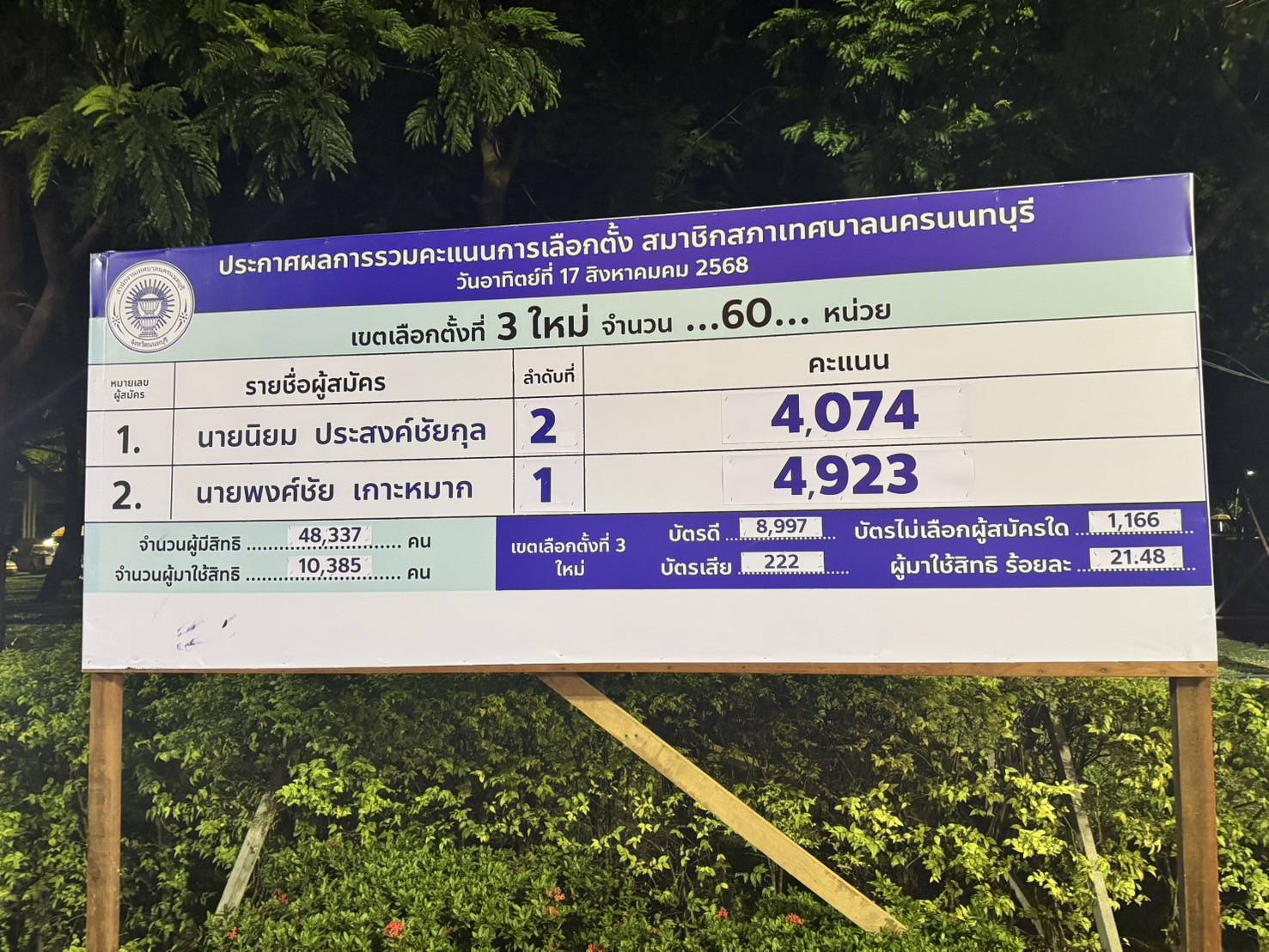 รายงานจากผู้สื่อข่าวล่าสุด หลังปิดหีบการเลือกตั้งเมื่อเวลา 17.00 น.ผลการเลือกตั้ง ส.ท.อย่างไม่เป็นทางการ นายนิยม ประสงค์ชัยกุล ผู้สมัครหมายเลข 1 จากพรรคประชาชน ได้ 4,074 คะแนน และนายพงศ์ชัย เกาะหมาก ผู้สมัครหมายเลข 2 จากกลุ่มพลังหนุ่ม ได้คะแนน 4,923 คะแนน โดยเขตนี้ผู้มีสิทธิ 48,337 คน ผู้มาใช้สิทธิ 10,385 คน คิดเป็น 21.48% บัตรดี 8,997 คิดเป็น 86.63% บัตรเสีย 222 คิดเป็น 2.14% บัตรไม่ประสงค์เลือกใคร 1,166 คิดเป็น 11.23%