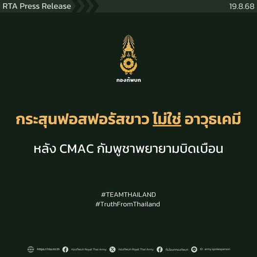 วันที่ 19 สิงหาคม 2568 พลตรี วินธัย สุวารี โฆษกกองทัพบก ชี้แจงกรณีนายเฮง รัตนา ผู้อำนวยการศูนย์ปฏิบัติการทุ่นระเบิดแห่งกัมพูชา (CMAC) เผยแพร่ข้อมูลอ้างว่า ผู้เชี่ยวชาญของ CMAC ตรวจพบกระสุนปืนใหญ่ขนาด 155 มิลลิเมตร บรรจุสารฟอสฟอรัสขาว (White Phosphorus – WP) ในพื้นที่จังหวัดอุดรมีชัย พร้อมทั้งกล่าวหาว่าเป็นผลจากการยิงของกองทัพไทยในช่วงความขัดแย้ง 5 วัน และเป็นกระสุนที่มีลักษณะเป็นอาวุธเพลิงและก่อควันพิษ