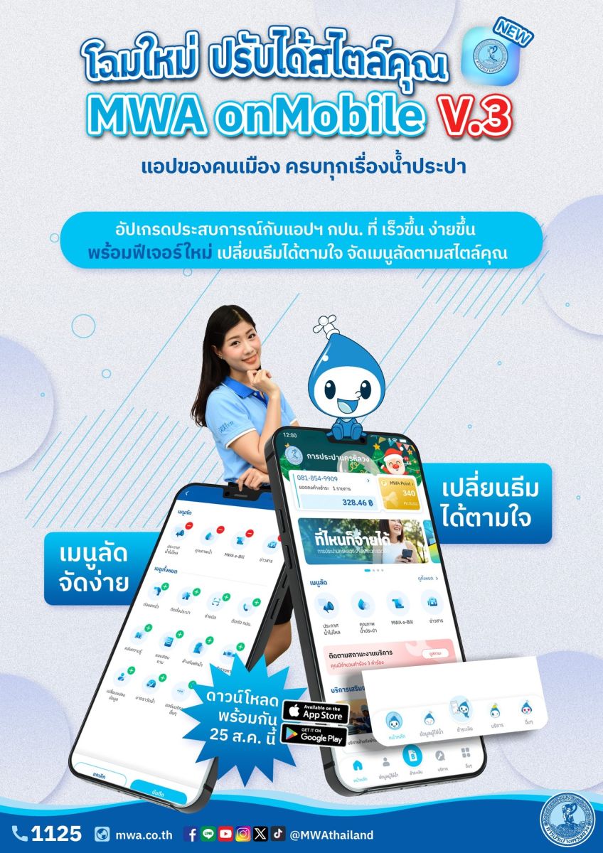 กปน. ปรับโฉมแอปพลิเคชัน MWA onMobile Version 3 เพิ่ม Feature เปลี่ยนธีมได้ตามใจชอบ และ Feature เมนูลัด จัดลำดับบริการที่ใช้งานบ่อยได้เอง ที่สำคัญยังมีการปรับปรุงให้สามารถเรียกใช้งานแอปพลิเคชันได้เร็วมากขึ้น ปรับปรุงประสิทธิภาพการแจ้งเตือนและการชำระเงิน พร้อมให้คุณดาวน์โหลดแล้ว วันที่ 25 ส.ค. 68 นี้