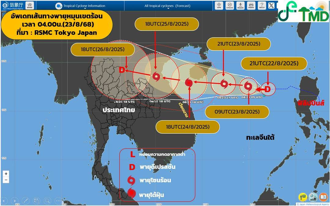 กรมอุตุนิยมวิทยา อัปเดตสถานการณ์พายุเช้าตรู่ วันนี้ 23 ส.ค.68 เวลา 04.00 น. พายุดีเปรสชันบริเวณทะเลจีนใต้ตอนบน ความเร็วลมสูงสุดใกล้ศูนย์กลางประมาณ 55 กิโลเมตรต่อชั่วโมง พายุนี้กำลังเคลื่อนตัวทางทิศตะวันตกด้วยความเร็วประมาณ 30 กิโลเมตรต่อชั่วโมง (เคลื่อนที่เร็ว) และมีแนวโน้มจะทวีกำลังแรงขึ้นเป็นพายุโซนร้อนในวันนี้ คาดว่าจะเคลื่อนขึ้นฝั่งบริเวณประเทศเวียดนามและประเทศลาวตอนบน ในช่วงวันที่ 25–26 ส.ค. 68 ประกอบกับมรสุมตะวันตกเฉียงใต้ที่พัดปกคลุมทะเลอันดามัน