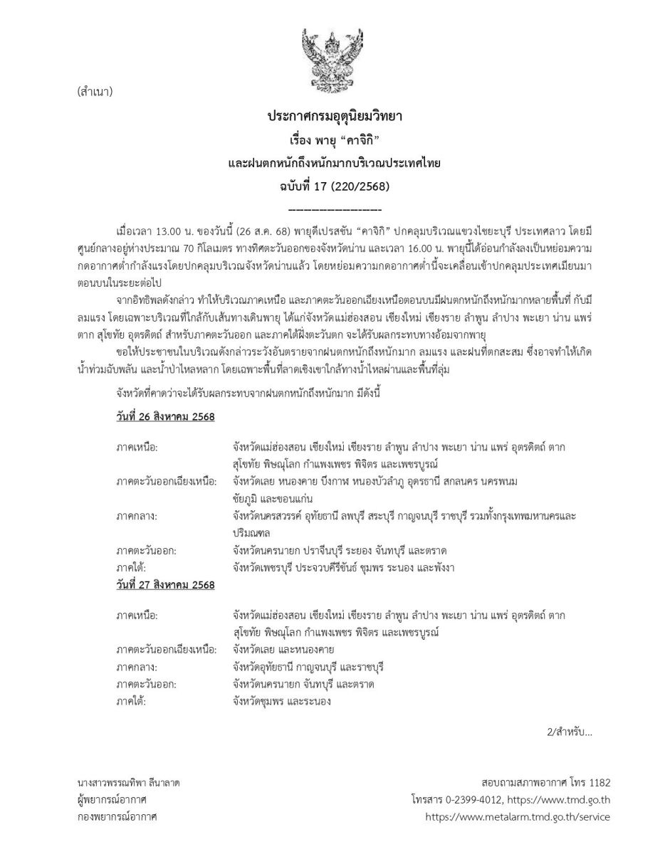 ประกาศกรมอุตุนิยมวิทยา เรื่อง พายุ “คาจิกิ” และฝนตกหนักถึงหนักมากบริเวณประเทศไทย ฉบับที่ 17 (220/2568)