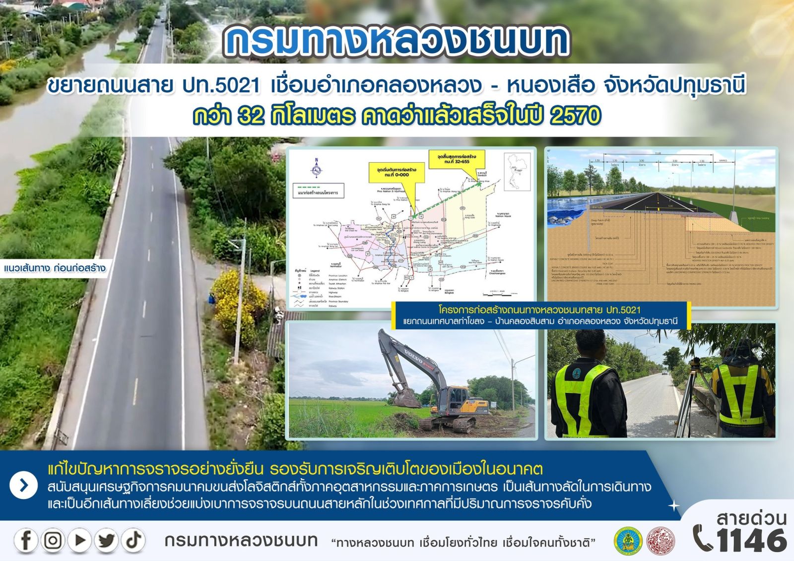 กรมทางหลวงชนบท บรรเทาการจราจรบนถนนสายหลัก รองรับการเจริญเติบโตของเมืองในอนาคต ขยายถนนสาย ปท.5021 เชื่อมอำเภอคลองหลวง - หนองเสือ จังหวัดปทุมธานี กว่า 32 กิโลเมตร คาดแล้วเสร็จในปี 2570