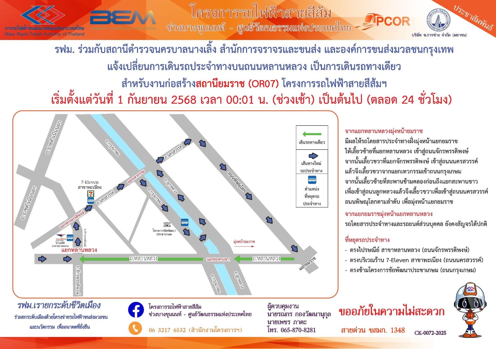 รฟม. ร่วมกับสถานีตำรวจนครบาลนางเลิ้ง สำนักการจราจรและขนส่ง และองค์การขนส่งมวลชนกรุงเทพ แจ้งเปลี่ยนการเดินรถประจำทางบนถนนหลานหลวง เป็นการเดินรถทางเดียว สำหรับงานก่อสร้างสถานียมราช (OR07) โครงการรถไฟฟ้าสายสีส้มฯ เริ่มตั้งแต่วันที่ 1 กันยายน 2568 เวลา 00:01 น. เป็นต้นไป (ตลอด 24 ชั่วโมง)