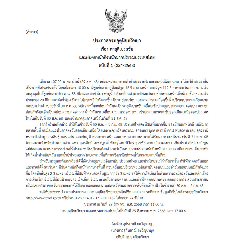 ประกาศกรมอุตุนิยมวิทยา เรื่อง พายุดีเปรสชัน และฝนตกหนักถึงหนักมากบริเวณประเทศไทย ฉบับที่ 1 (224/2568)