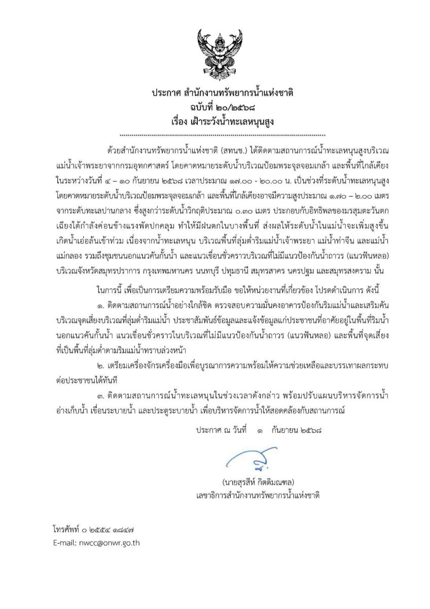 สำนักงานทรัพยากรน้ำแห่งชาติ ประกาศ ฉบับที่ 20/2568 เรื่อง เฝ้าระวังน้ำทะเลหนุนสูง 4 – 10 กันยายน 2568 ด้วยสำนักงานทรัพยากรน้ำแห่งชาติ (สทนช.) ได้ติดตามสถานการณ์น้ำทะเลหนุนสูงบริเวณแม่น้ำเจ้าพระยาจากกรมอุทกศาสตร์ โดยคาดหมายระดับน้ำบริเวณป้อมพระจุลจอมเกล้า และพื้นที่ใกล้เคียงในระหว่างวันที่ 4 – 10 กันยายน 2568 เวลาประมาณ 17.00 - 20.00 น. เป็นช่วงที่ระดับน้ำทะเลหนุนสูง
