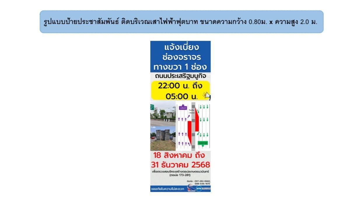 กทพ. โครงการระบบทางด่วนขั้นที่ 3 สายเหนือ ตอน N 2 เเจ้งเบี่ยงช่องจราจร ทางขวา 1 ช่องจราจร ถ.ประเสริฐมนูกิจ