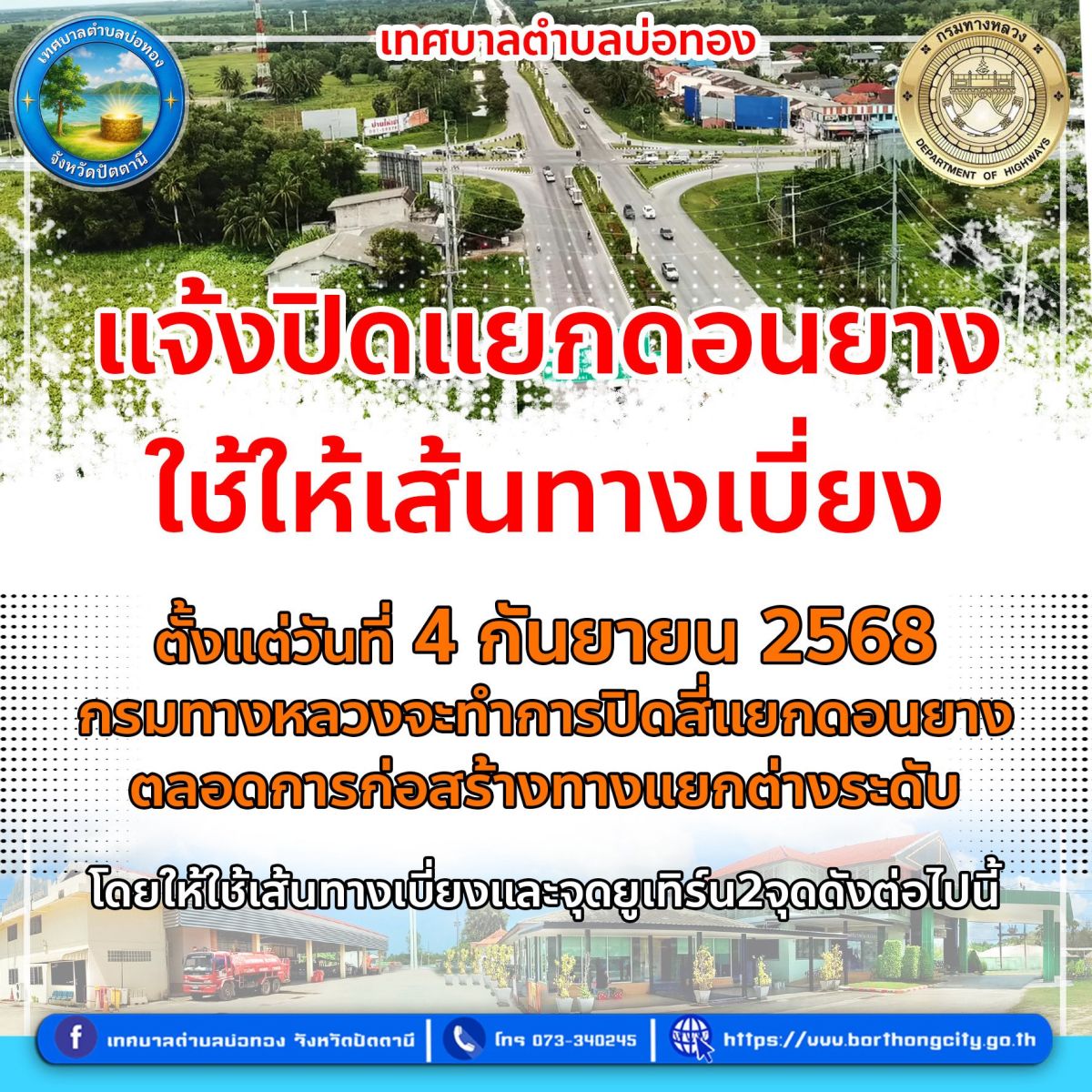 เทศบาลตำบลบ่อทอง แจ้งปิด "แยกดอนยาง" ขอให้เส้นทางเบี่ยง ตั้งแต่วันที่ 4 กันยายน 2568 จ.ปัตตานี