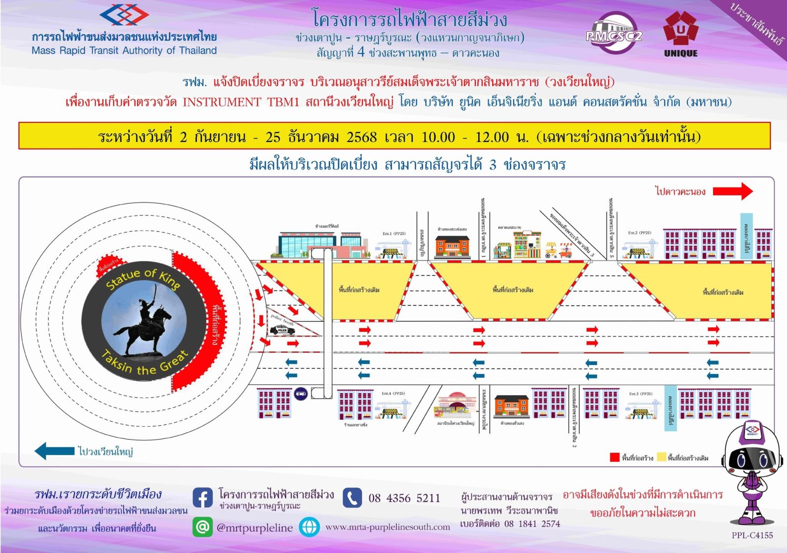 การรถไฟฟ้าขนส่งมวลชนแห่งประเทศไทย (รฟม.) แจ้งว่า บริษัท ยูนิค เอ็นจิเนียริ่ง แอนด์ คอนสตรัคชั่น จำกัด (มหาชน) ผู้รับจ้างงานออกแบบและก่อสร้างอุโมงค์ทางวิ่งและสถานีใต้ดิน โครงการรถไฟฟ้าสายสีม่วง ช่วงเตาปูน - ราษฎร์บูรณะ (วงแหวนกาญจนาภิเษก) สัญญาที่ 4 ช่วงสะพานพุทธ - ดาวคะนอง มีความจำเป็นต้องปิดเบี่ยงจราจร บริเวณอนุสาวรีย์สมเด็จพระเจ้าตากสินมหาราช (วงเวียนใหญ่) เพื่องานเก็บค่าตรวจวัด INSTRUMENT TBM1 สถานีวงเวียนใหญ่ ระหว่างวันที่ 2 กันยายน - 25 ธันวาคม 2568 เวลา 10.00 - 12.00 น. (เฉพาะช่วงกลางวันเท่านั้น) มีผลให้บริเวณปิดเบี่ยงสามารถสัญจรได้ 3 ช่องจราจร