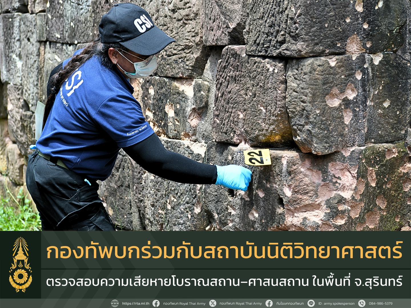 กองทัพบกยังคงปฏิบัติภารกิจลงพื้นที่ตรวจสอบและเก็บหลักฐานจากเหตุการณ์การสู้รบที่เกิดขึ้นบริเวณชายแดนไทย–กัมพูชา ต่อเนื่องเป็นวันที่ 2 ร่วมกับสถาบันนิติวิทยาศาสตร์ กระทรวงยุติธรรม หลังจากสถานการณ์การปะทะชายแดนคลี่คลายลง และหน่วย EOD ของทหารและตำรวจได้เข้าเคลียร์พื้นที่จนปลอดภัยแล้ว โดยเมื่อวานนี้ (1 ก.ย. 68) ได้ดำเนินการเก็บหลักฐานในพื้นที่ปราสาทตาเมือนธม และวัดไทยนิยมพัฒนาราม ตำบลบักได อำเภอพนมดงรัก จังหวัดสุรินทร์ ซึ่งจุดที่เข้าตรวจสอบความเสียหายมีดังนี้