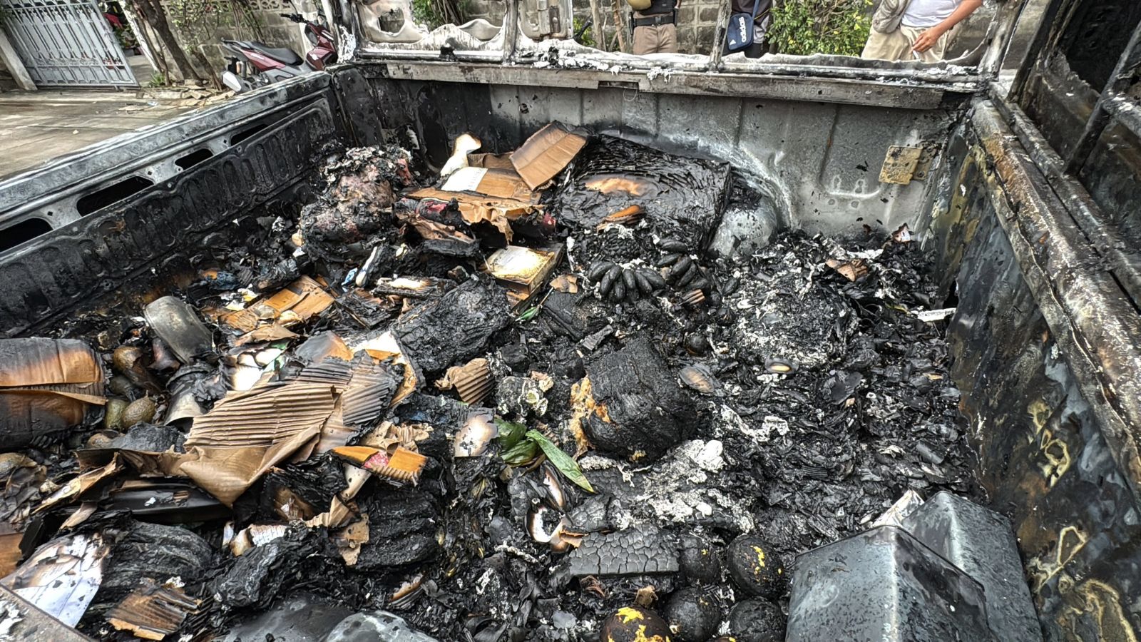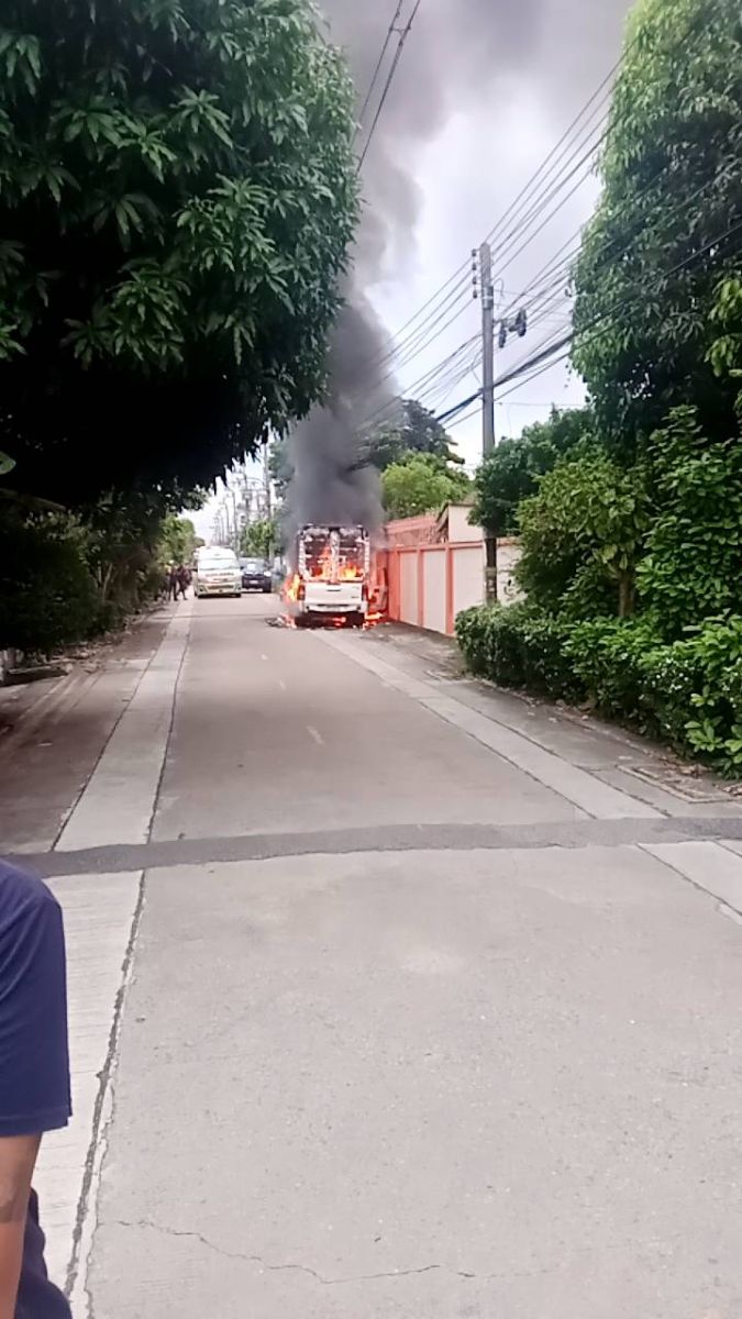 ไฟลุกไหม้รถขนส่งพัสดุวอดทั้งคัน กระจกระเบิดบาดคอคนขับเจ็บสาหัส